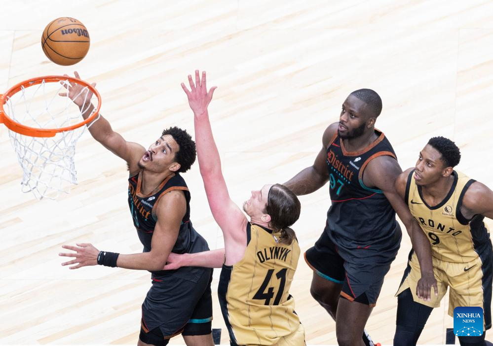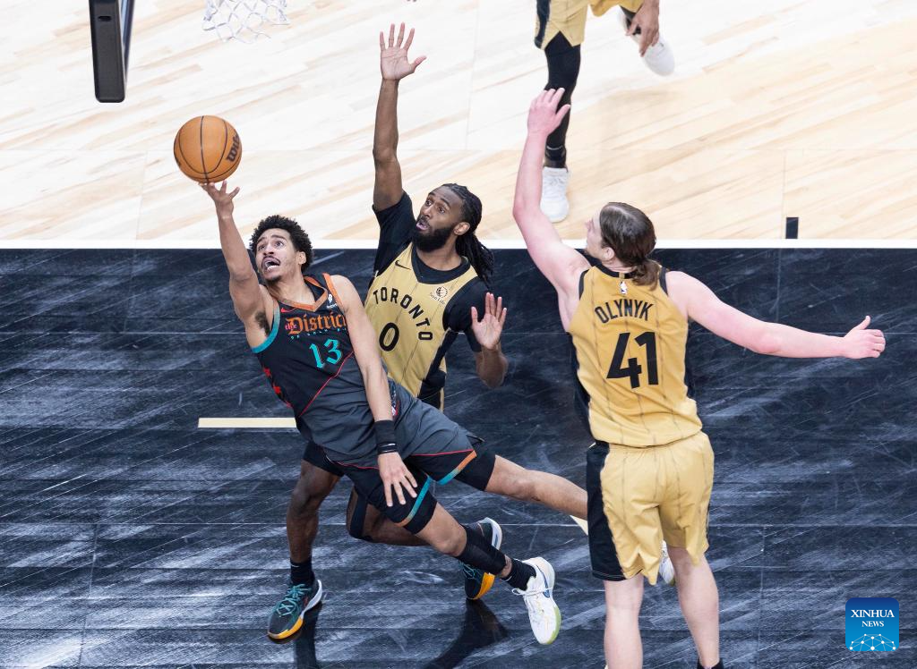 Jules Bernard (L) of Washington Wizards makes a layup during the 2023-2024 NBA regular season game between Toronto Raptors and Washington Wizards in Toronto, Canada, April 7, 2024. (Photo by Zou Zheng/Xinhua)