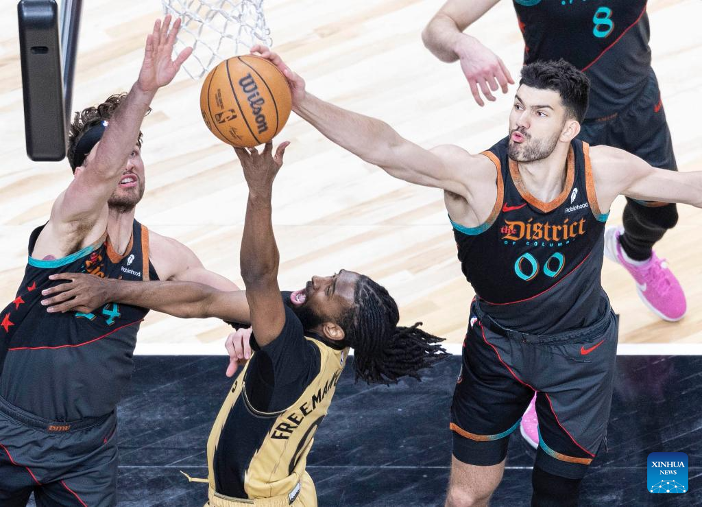 Tristan Vukcevic (R) of Washington Wizards blocks Javon Freeman-Liberty (C) of Toronto Raptors during the 2023-2024 NBA regular season game between Toronto Raptors and Washington Wizards in Toronto, Canada, April 7, 2024. (Photo by Zou Zheng/Xinhua)