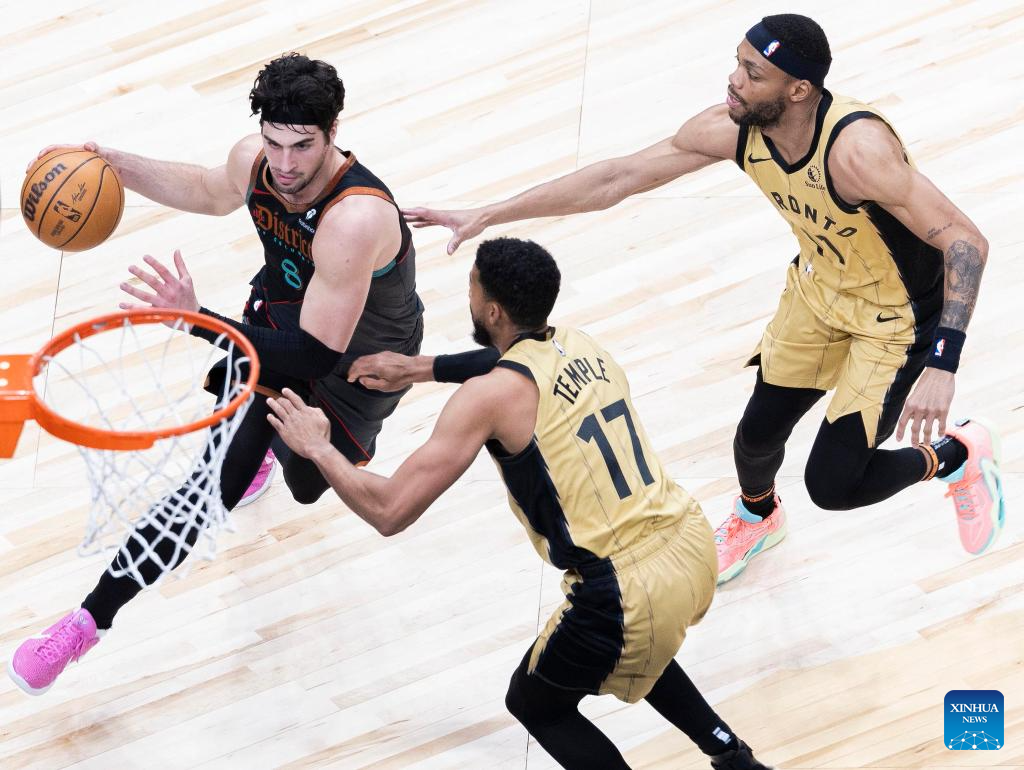 Deni Avdija (L) of Washington Wizards breaks through during the 2023-2024 NBA regular season game between Toronto Raptors and Washington Wizards in Toronto, Canada, April 7, 2024. (Photo by Zou Zheng/Xinhua)