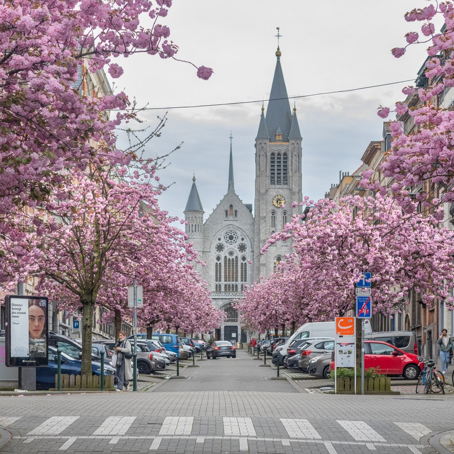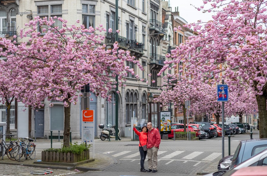 Cherry blossoms are pictured on the street in Brussels, Belgium, April 5, 2024. (Xinhua/Meng Dingbo)■