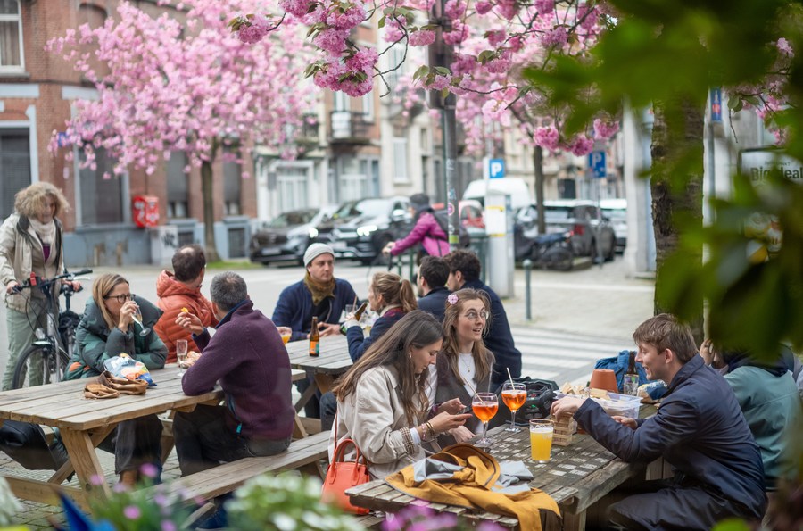 People enjoy themselves under cherry blossoms on the street in Brussels, Belgium, April 5, 2024. (Xinhua/Meng Dingbo)