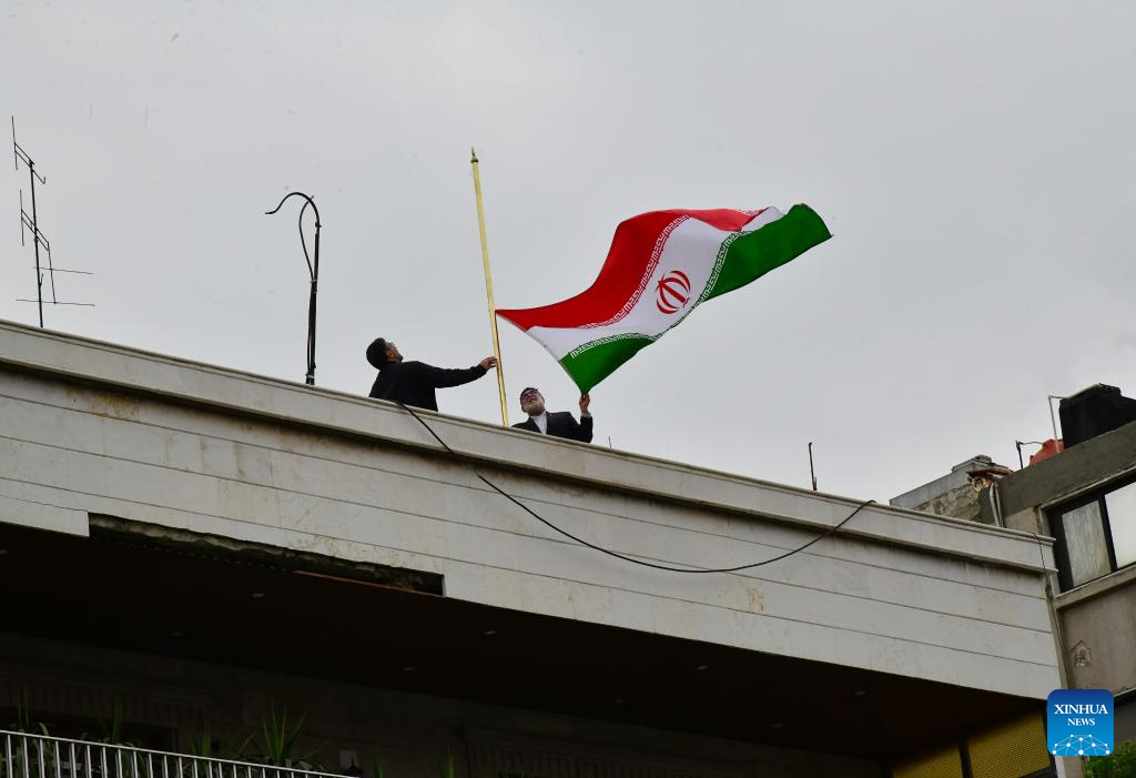 The Iranian flag is raised over the new consulate in Damascus, Syria, on April 8, 2024. Iranian Foreign Minister Hossein Amir-Abdollahian opened a new consulate building in the Syrian capital of Damascus on Monday, following the destruction of the previous consulate by an Israeli strike last week. (Photo by Ammar Safarjalani/Xinhua)