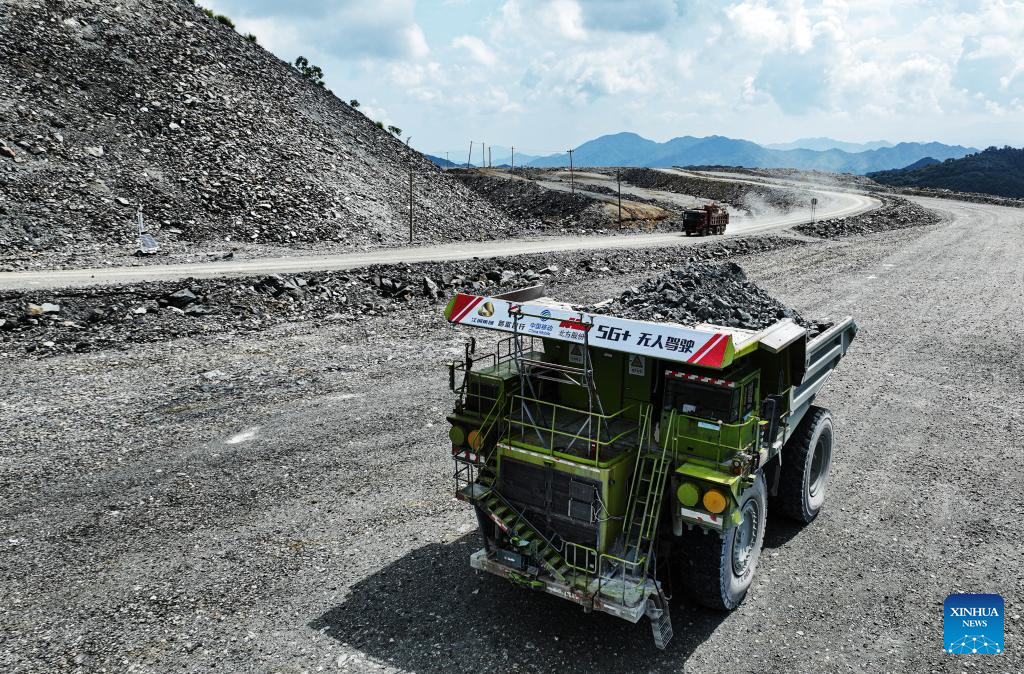 An unmanned mining vehicle supported by 5G technology works at a mine field of Jiangxi Copper Co., Ltd. (Jiangxi Copper) in Dexing City, east China's Jiangxi Province, Aug. 24, 2023. (Photo by Zhang Weifeng/Xinhua)