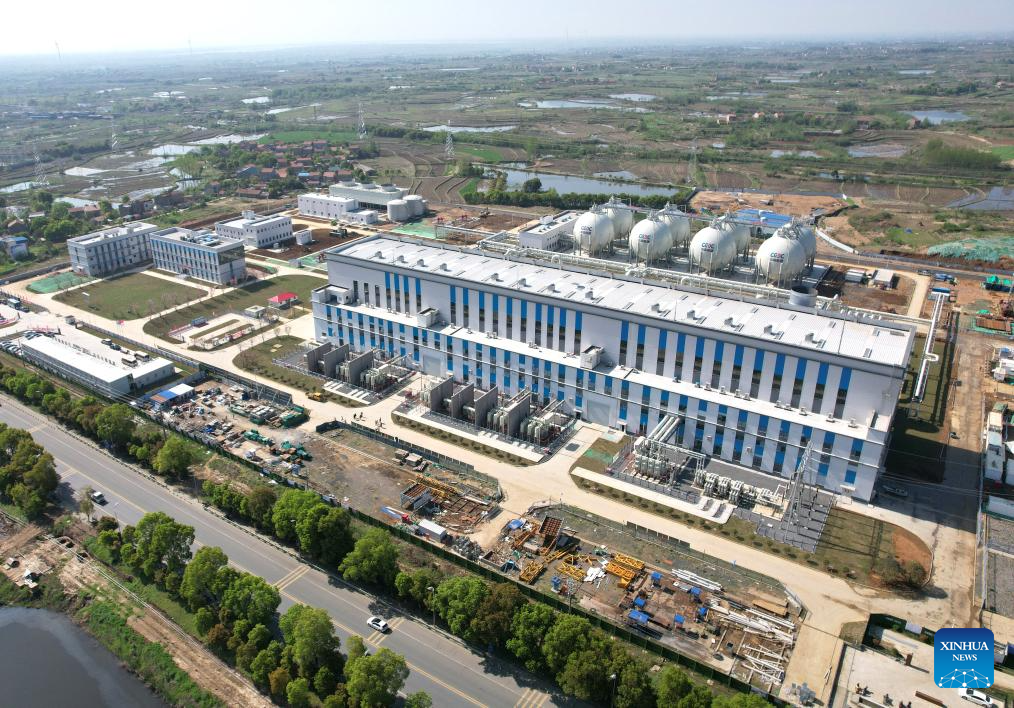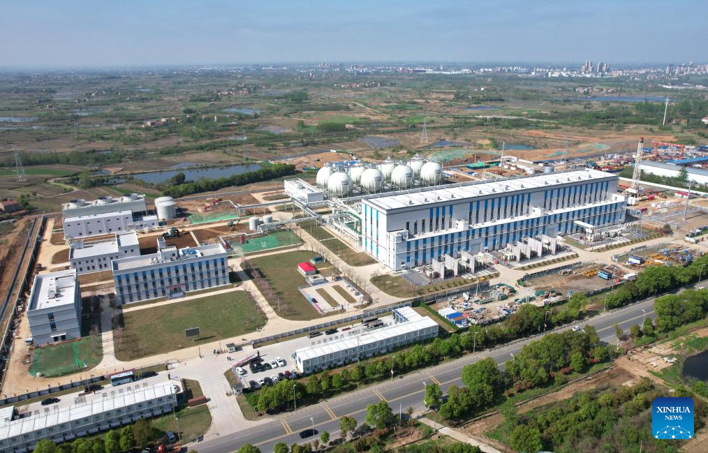 An aerial drone photo taken on April 9, 2024 shows a view of the 300 MW compressed air energy storage station in Yingcheng, central China's Hubei Province. (Xinhua/Cheng Min)