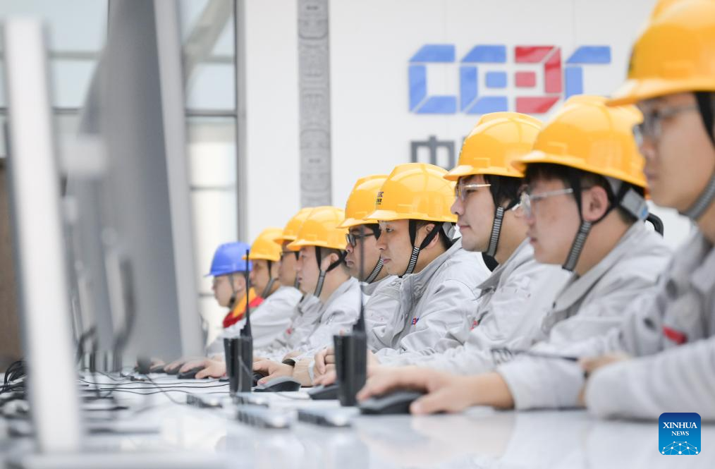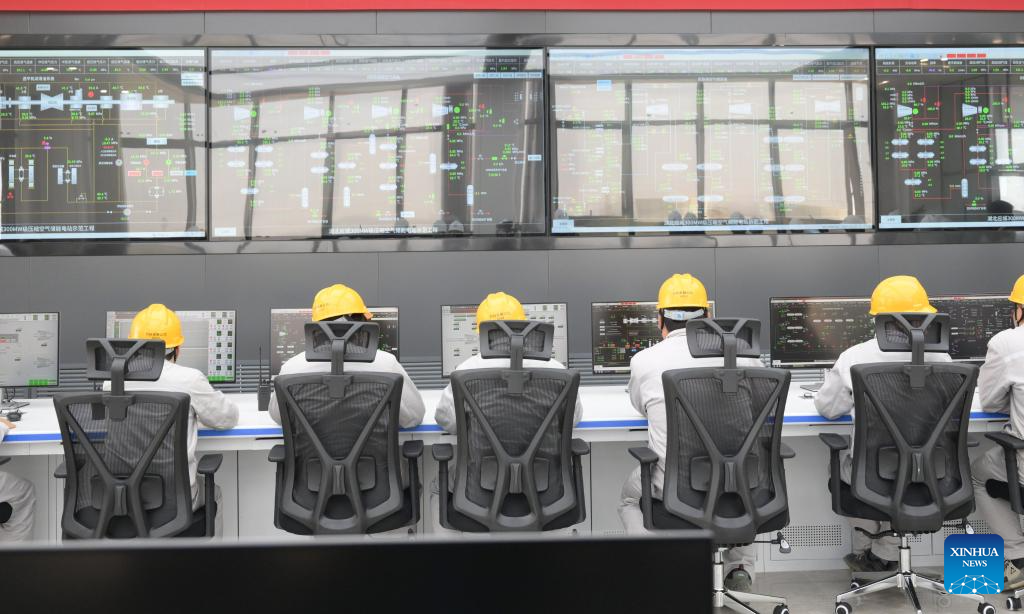 Staff members work at the 300 MW compressed air energy storage station in Yingcheng, central China's Hubei Province, April 9, 2024. (Xinhua/Cheng Min)