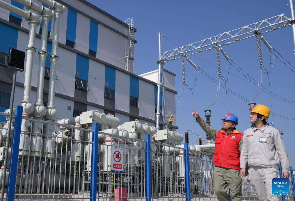 Staff members inspect the 300 MW compressed air energy storage station in Yingcheng, central China's Hubei Province, April 9, 2024. (Xinhua/Cheng Min)