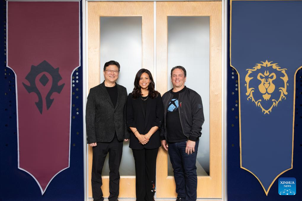 This photo shows CEO and Director of NetEase William Ding (L), President of Blizzard Entertainment Johanna Faries (C) and CEO of Microsoft Gaming Phil Spencer. (NetEase/Handout via Xinhua)