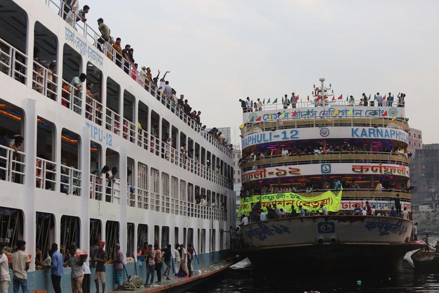 Ferries packed with homebound travelers are seen at Sadarghat Launch Terminal in Dhaka, Bangladesh, April 8, 2024. (Xinhua)