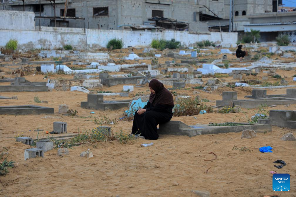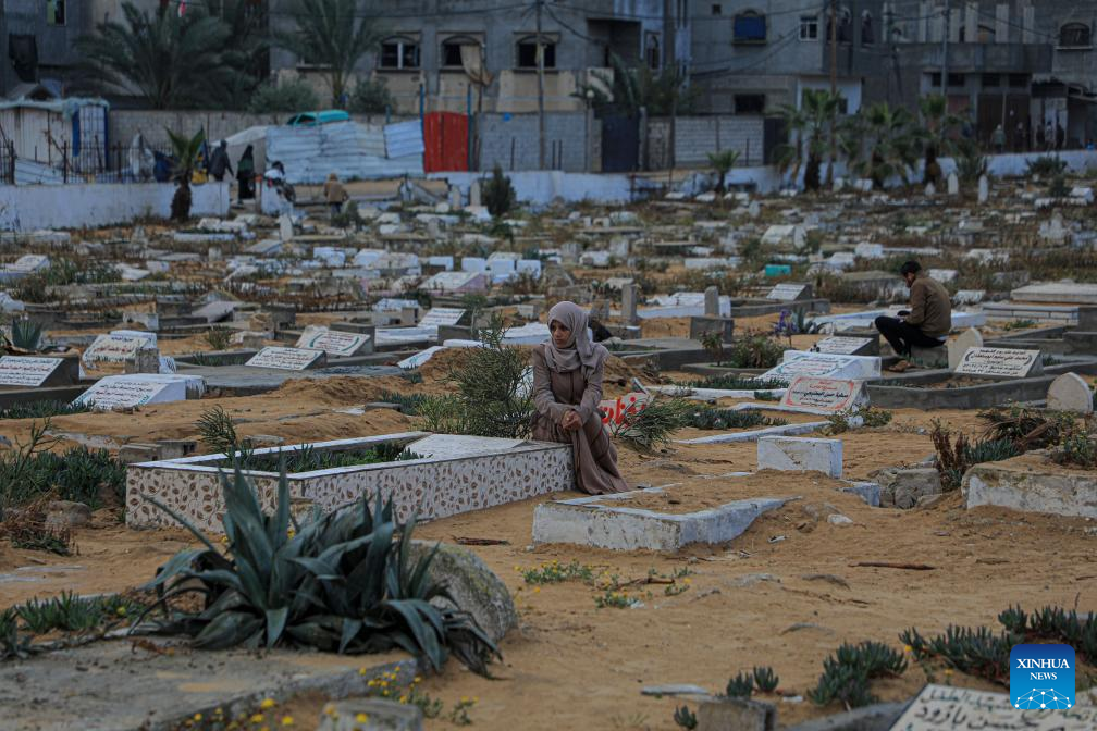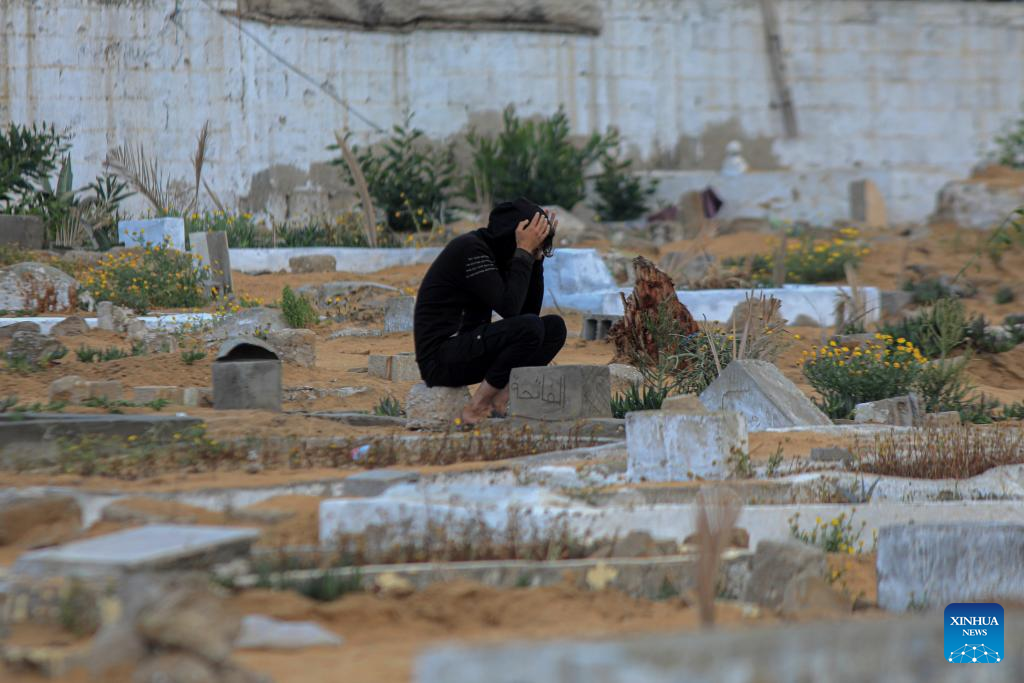 A Palestinian woman visits a mass cemetery of people killed in the Israel-Hamas conflict in the southern Gaza Strip city of Rafah, on April 10, 2024. The Ministry of Health in Gaza said Wednesday that the Palestinian death toll has risen to 33,482 as a result of ongoing Israeli attacks. (Photo by Rizek Abdeljawad/Xinhua)