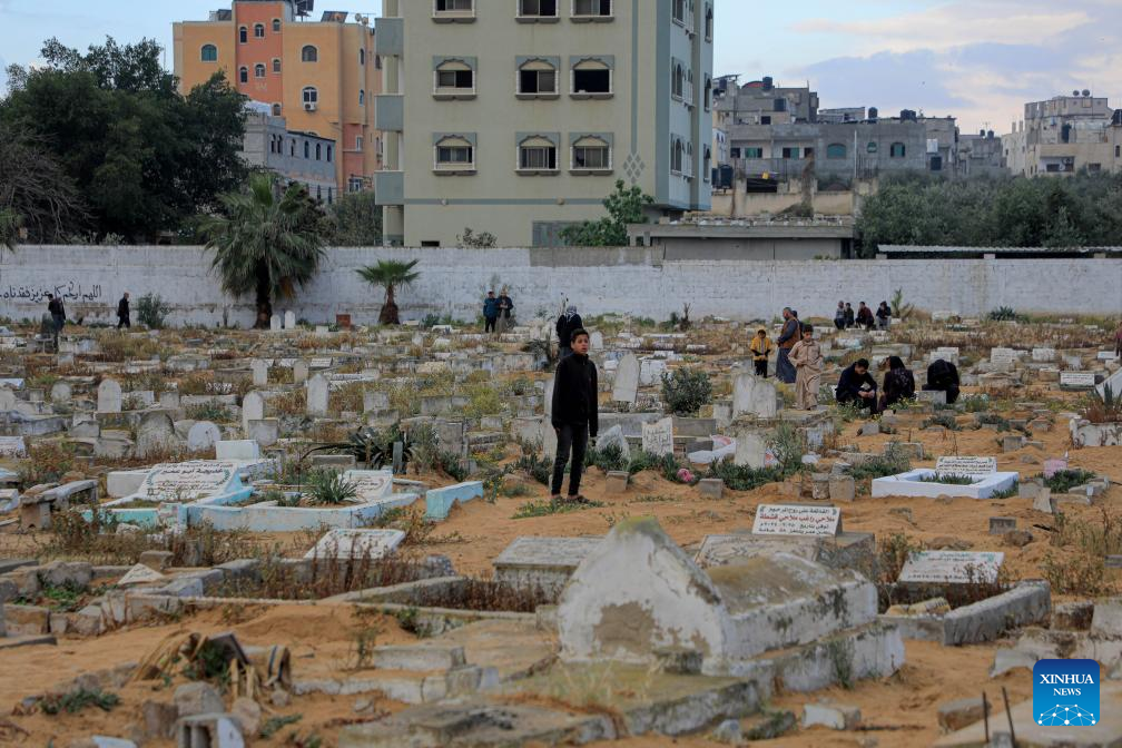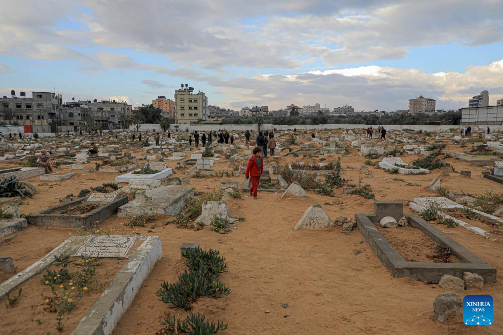 Palestinians visit a mass cemetery of people killed in the Israel-Hamas conflict in the southern Gaza Strip city of Rafah, on April 10, 2024. The Ministry of Health in Gaza said Wednesday that the Palestinian death toll has risen to 33,482 as a result of ongoing Israeli attacks. (Photo by Rizek Abdeljawad/Xinhua)