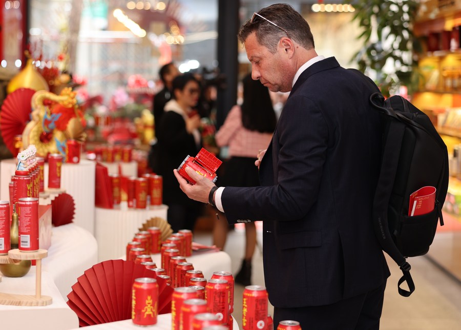 A customer looks at a model can of WALOVI herbal tea in New York City, the United States, April 10, 2024. (Photo by Winston Zhou/Xinhua)