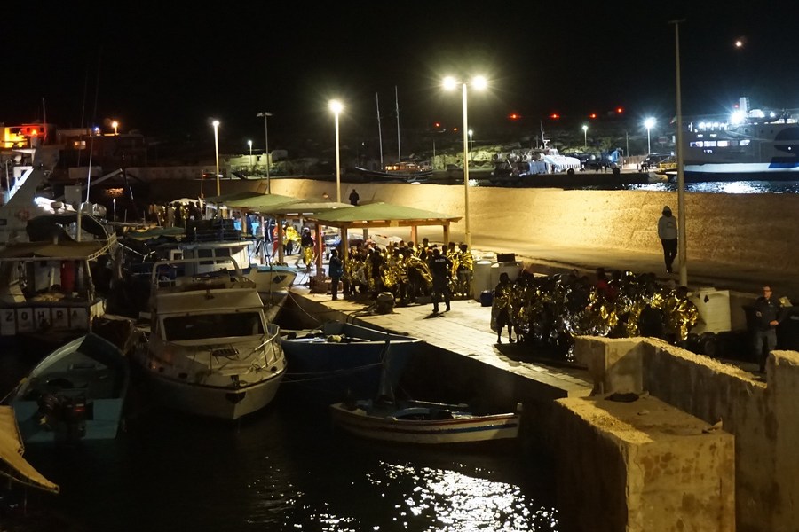 Migrants arrive at Italy's southernmost island of Lampedusa and wait to be directed by police and Red Cross staff members to a nearby migrant reception center on Nov. 20, 2023. (Photo by Leonardo Cinieri Lombroso/Xinhua)
