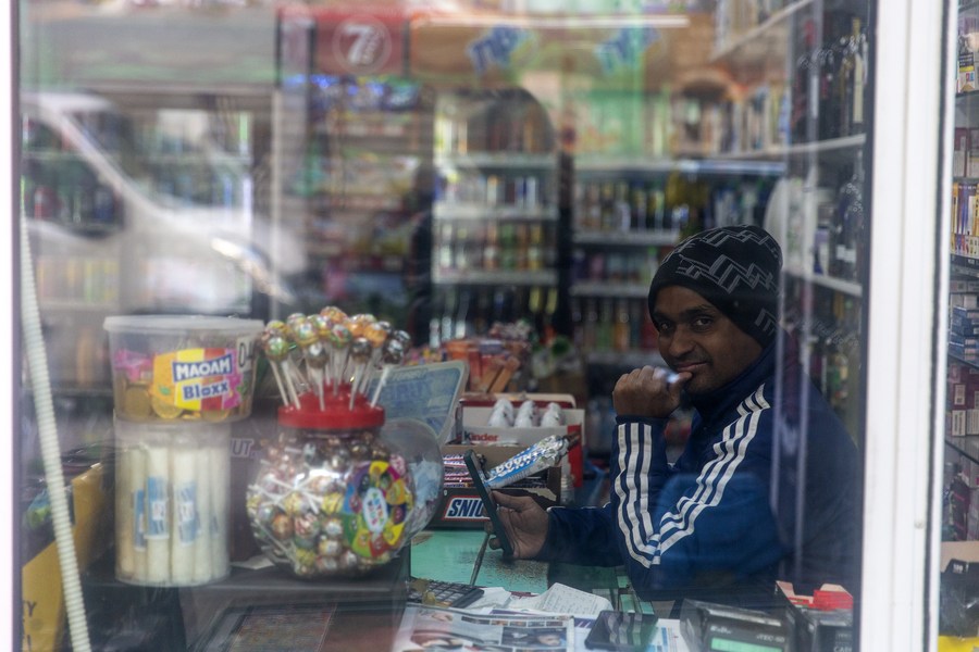 A migrant poses in his shop in Athens, Greece, on Dec. 21, 2023. (Xinhua/Marios Lolos)