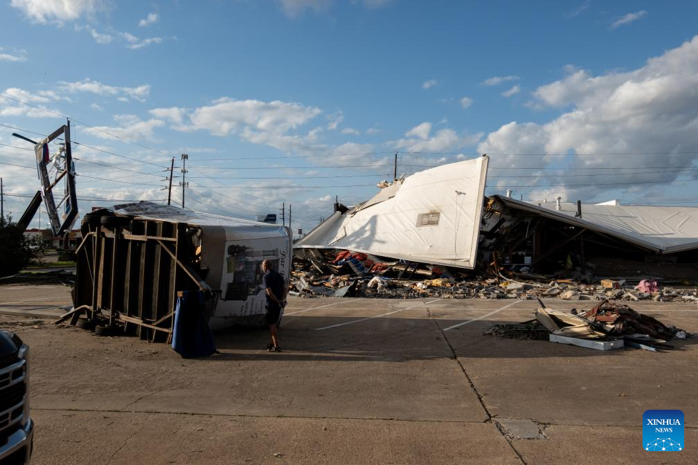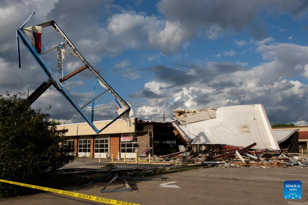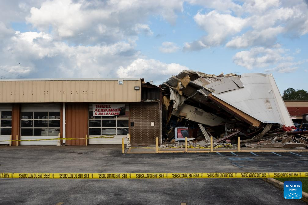 A damaged store is pictured in Slidell, Louisiana, the United States, April 11, 2024. One person was killed and more than 10 others were injured after severe storms battered the U.S. South stretching from Texas to Florida on Wednesday, authorities said. (Photo by Lan Wei/Xinhua)