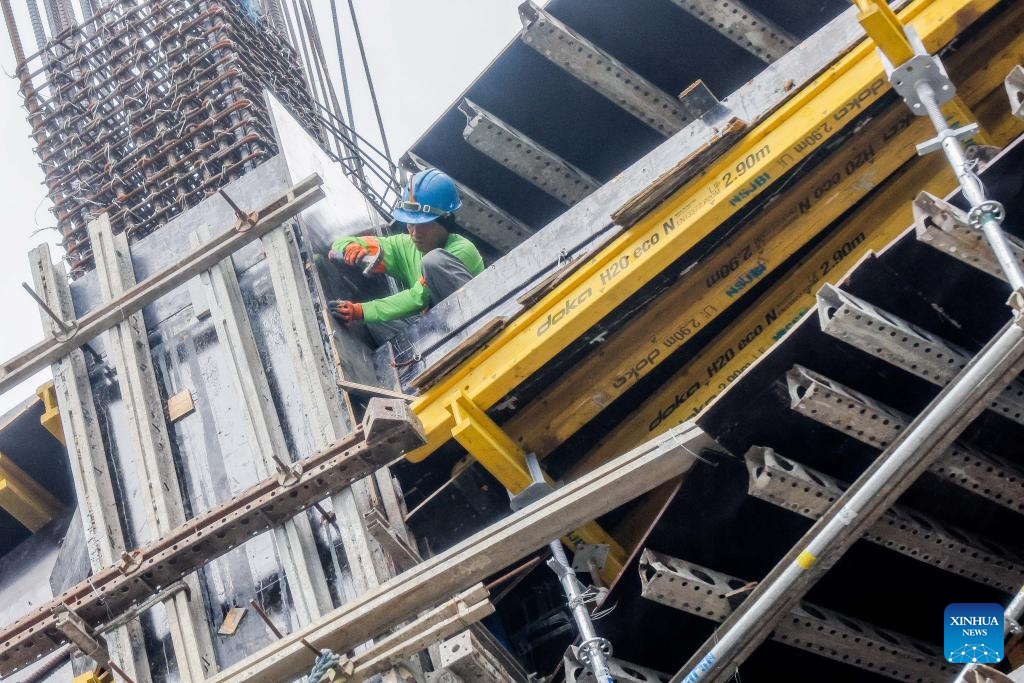 A worker is seen at a construction site in Quezon City, the Philippines, April 11, 2024. Asia and the Pacific's economy remains strong, with growth rate in region's developing economies projected at 4.9 percent in 2024 and 2025, the Asian Development Bank (ADB) Thursday said in its latest outlook report. (Xinhua/Rouelle Umali)