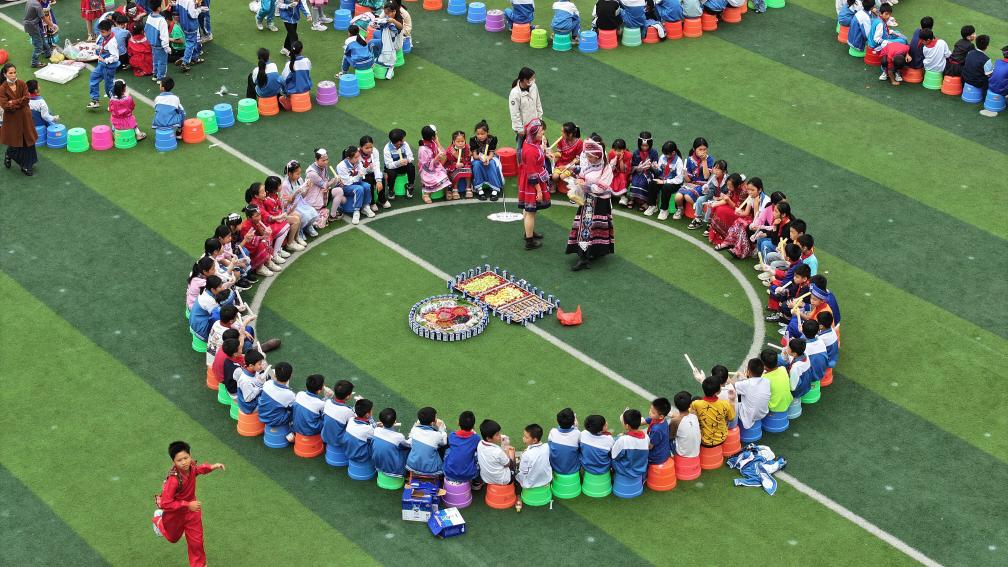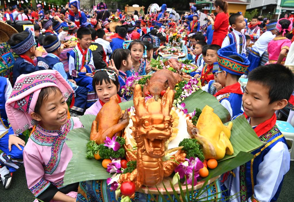 Teachers and pupils of a primary school take part in a celebration of Sanyuesan Festival in Nanning, capital of south China's Guangxi Zhuang Autonomous Region, April 10, 2024. (Xinhua/Zhou Hua)