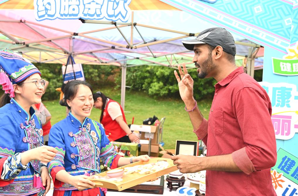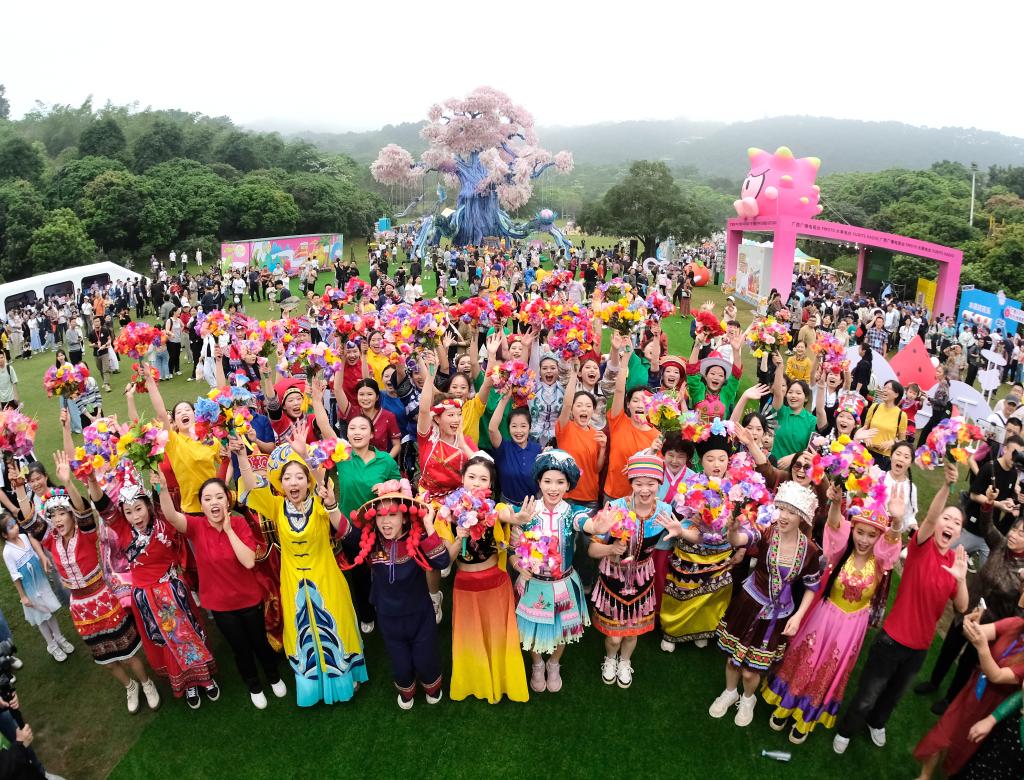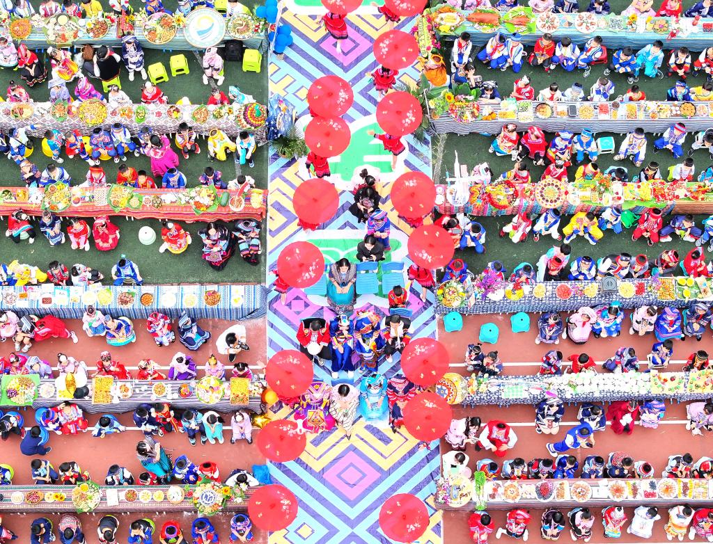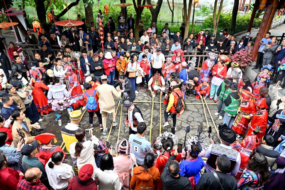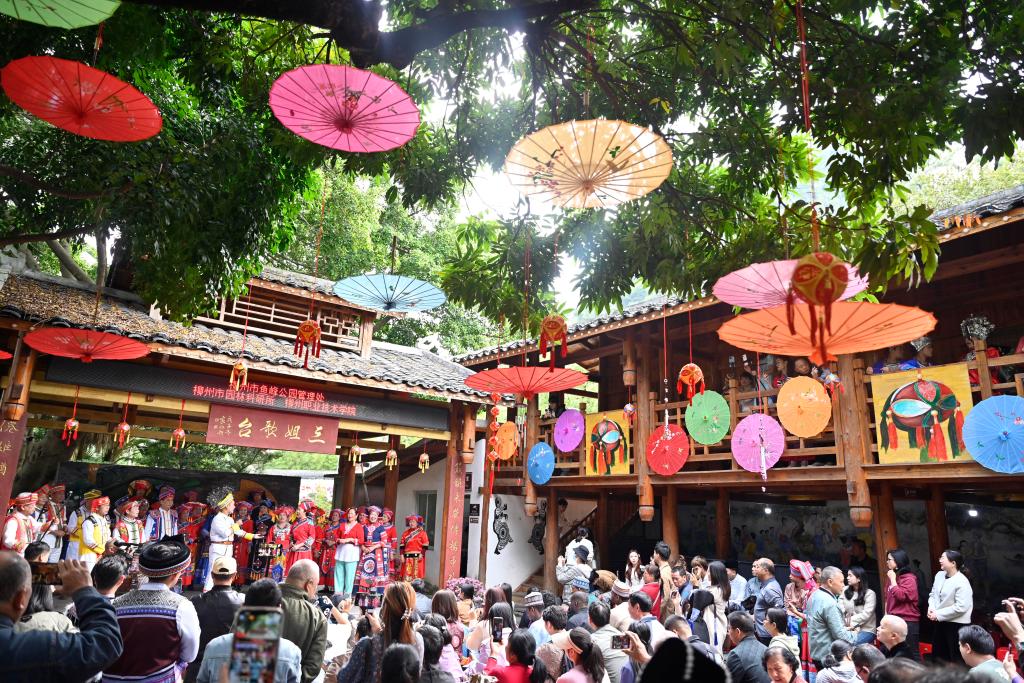 A drone photo taken on April 10, 2024 shows teachers and pupils of a primary school taking part in a celebration of Sanyuesan Festival in Nanning, capital of south China's Guangxi Zhuang Autonomous Region. (Xinhua/Zhou Hua)People pose for a group photo during a celebration of the Sanyuesan Festival in Nanning, capital of south China's Guangxi Zhuang Autonomous Region, April 11, 2024. (Xinhua/Zhou Hua)People dance to celebrate the Sanyuesan Festival in Nanning, capital of south China's Guangxi Zhuang Autonomous Region, April 11, 2024. (Xinhua/Zhou Hua)A foreign tourist tastes local food during a celebration of the Sanyuesan Festival in Nanning, capital of south China's Guangxi Zhuang Autonomous Region, April 11, 2024. (Xinhua/Zhou Hua)Citizens and visitors sing songs in a celebration of Sanyuesan Festival in Liuzhou, south China's Guangxi Zhuang Autonomous Region, April 8, 2024. (Xinhua/Huang Xiaobang)Teachers and pupils of a primary school perform bamboo pole dance in a celebration of Sanyuesan Festival in Qinzhou City, south China's Guangxi Zhuang Autonomous Region, April 10, 2024. (Xinhua/Zhang Ailin)Citizens and visitors perform bamboo pole dance in a celebration of Sanyuesan Festival in Liuzhou, south China's Guangxi Zhuang Autonomous Region, April 8, 2024. (Xinhua/Huang Xiaobang)A drone photo taken on April 10, 2024 shows teachers and pupils of a primary school taking part in a celebration of Sanyuesan Festival in Qinzhou City, south China's Guangxi Zhuang Autonomous Region. (Xinhua/Zhang Ailin)People take part in a celebration of Sanyuesan Festival on a construction site in Nanning, capital of south China's Guangxi Zhuang Autonomous Region, April 10, 2024. (Xinhua/Lu Boan)Teachers and children of a kindergarten take part in a celebration of Sanyuesan Festival in Liuzhou City, south China's Guangxi Zhuang Autonomous Region, April 9, 2024. (Xinhua/Huang Xiaobang)