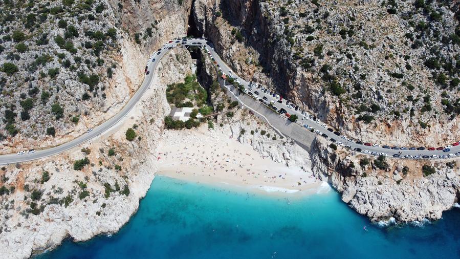 An aerial drone photo taken on April 11, 2024, shows tourists enjoying leisure time at Kaputas Beach in Kas District, Antalya, Türkiye. (Mustafa Kaya/Handout via Xinhua)