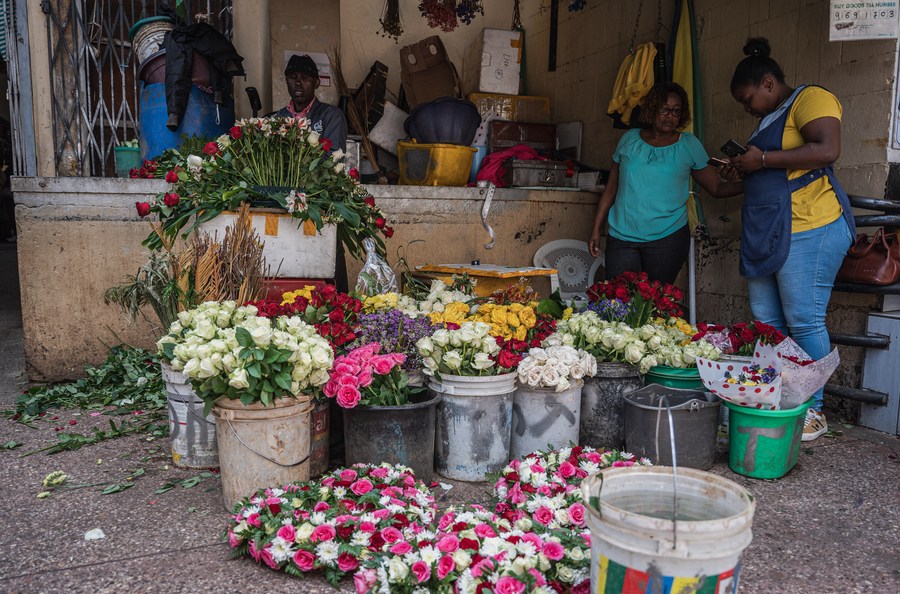 Vendors sell flowers at a market in Nairobi, Kenya, July 10, 2023. (Xinhua/Wang Guansen)