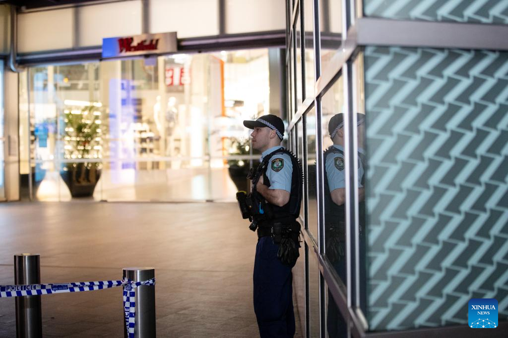 Police officers guard the entrance of a shopping center after a knife attack in Sydney, Australia, April 13, 2024. Six people were killed in a knife attack at a shopping center in Australia's Sydney on Saturday and the attacker was shot dead by police, police said. (Xinhua/Ma Ping)