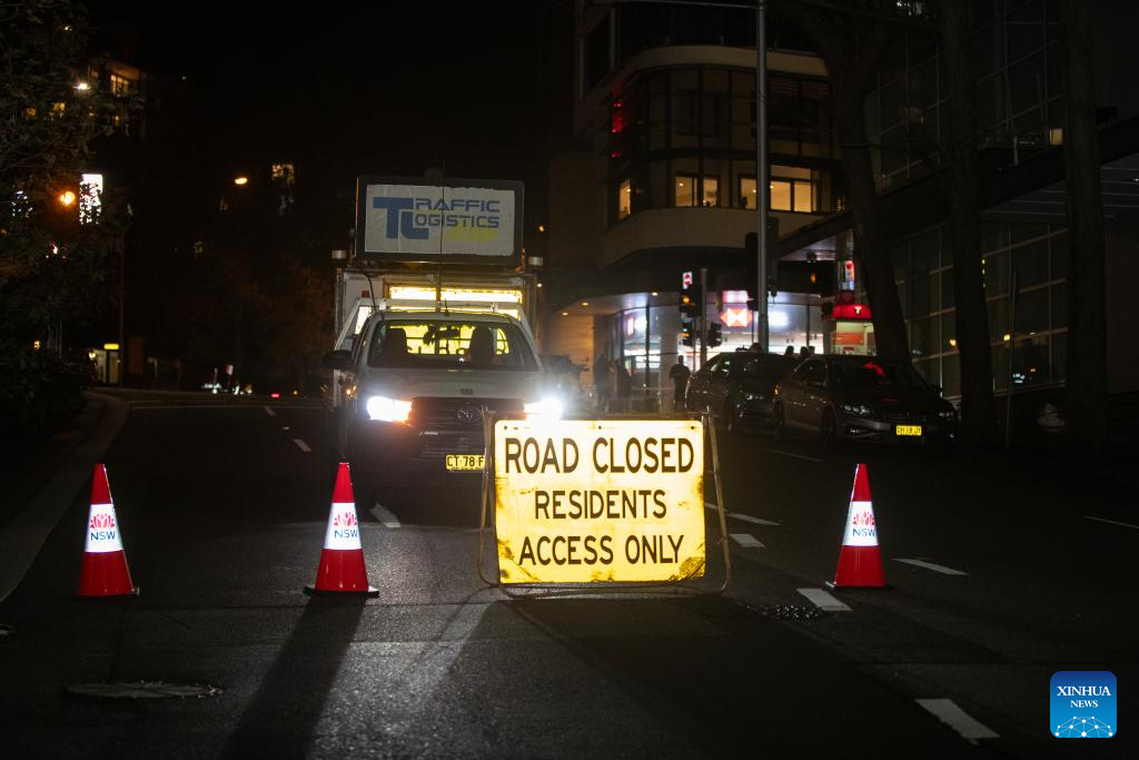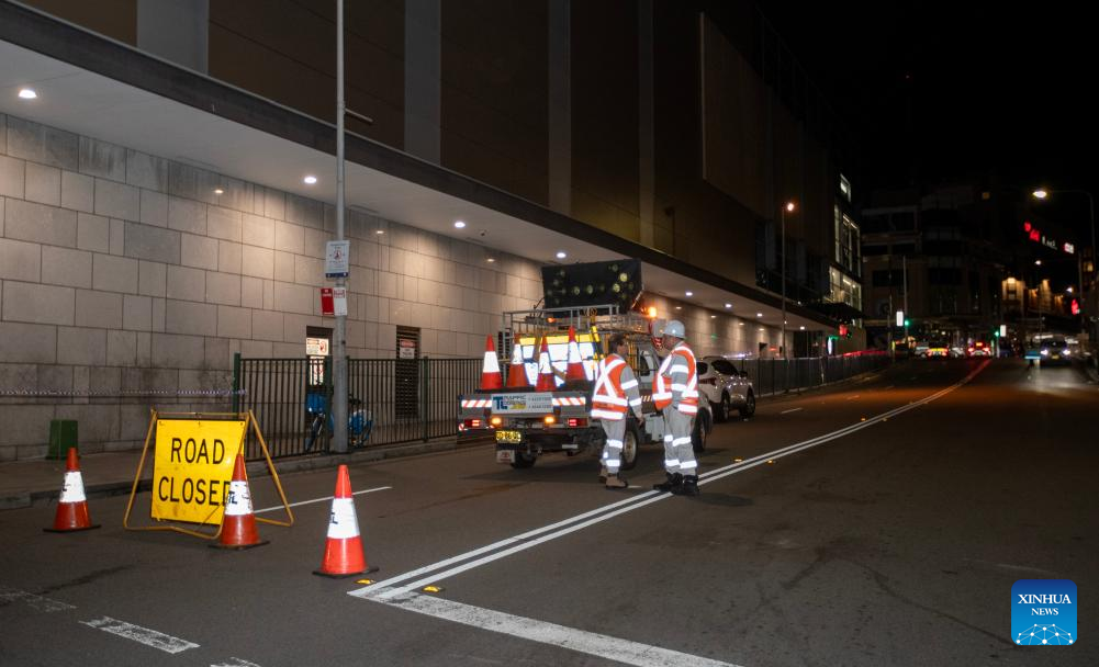 This photo taken on April 13, 2024 shows a closed road near a shopping center after a knife attack in Sydney, Australia. Six people were killed in a knife attack at a shopping center in Australia's Sydney on Saturday and the attacker was shot dead by police, police said. (Xinhua/Ma Ping)