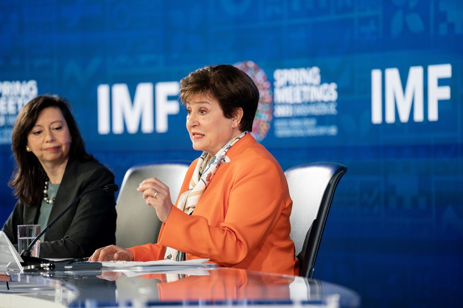 Managing Director of the International Monetary Fund (IMF) Kristalina Georgieva (R) attends a press conference in Washington, D.C., the United States, on April 13, 2023.(Xinhua/Liu Jie)