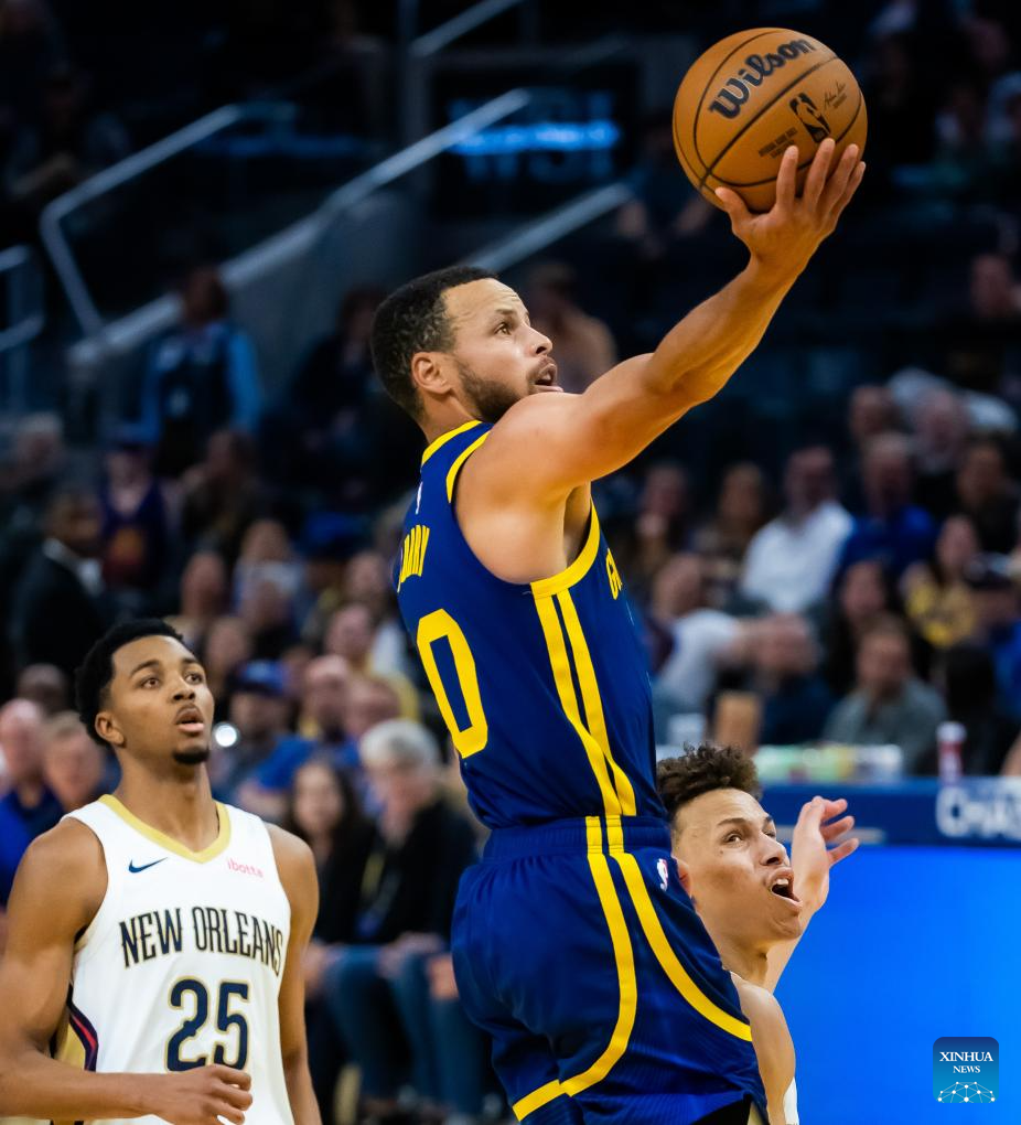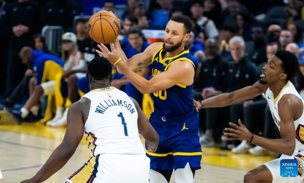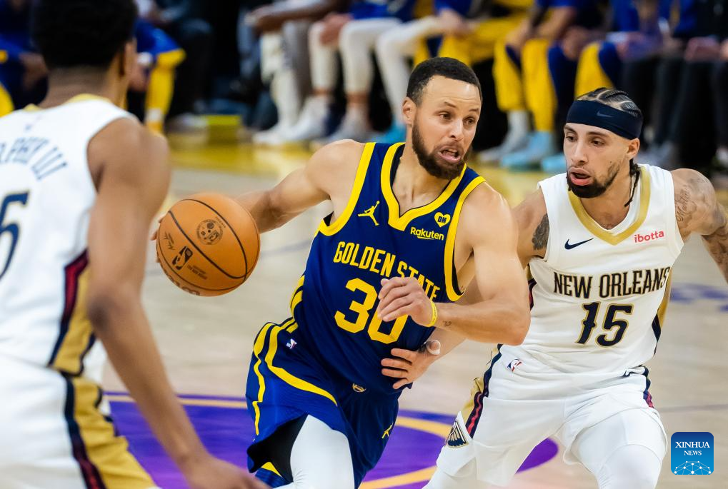 Stephen Curry (C) of Golden State Warriors competes during the NBA regular season game between Golden State Warriors and New Orleans Pelicans in San Francisco, the United States, April 12, 2024. (Photo by Dong Xudong/Xinhua)