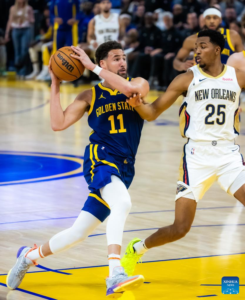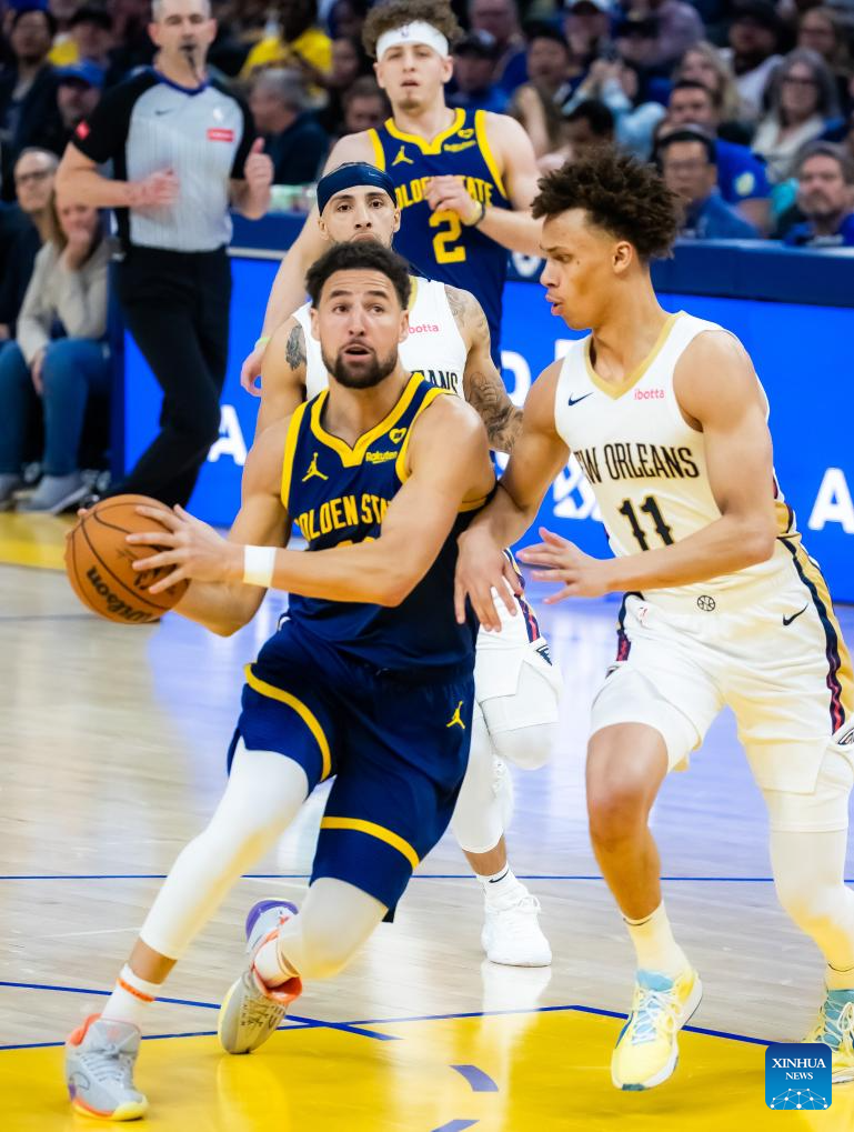 Klay Thompson (Front, L) of Golden State Warriors competes during the NBA regular season game between Golden State Warriors and New Orleans Pelicans in San Francisco, the United States, April 12, 2024. (Photo by Dong Xudong/Xinhua)