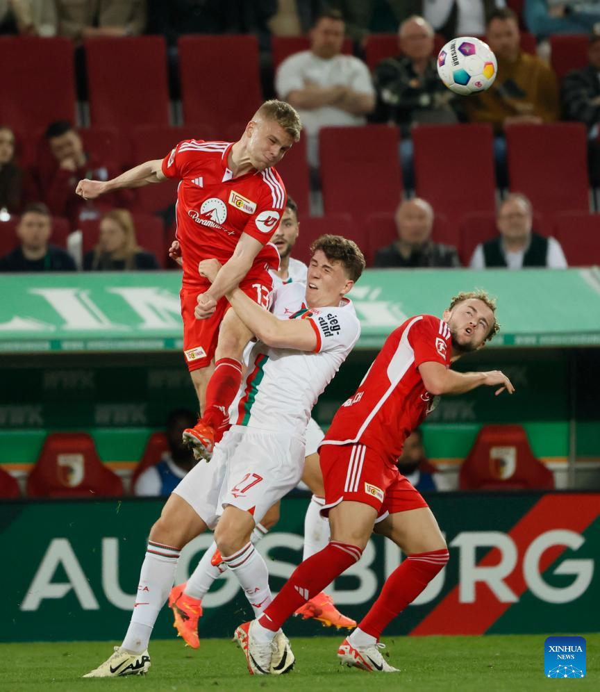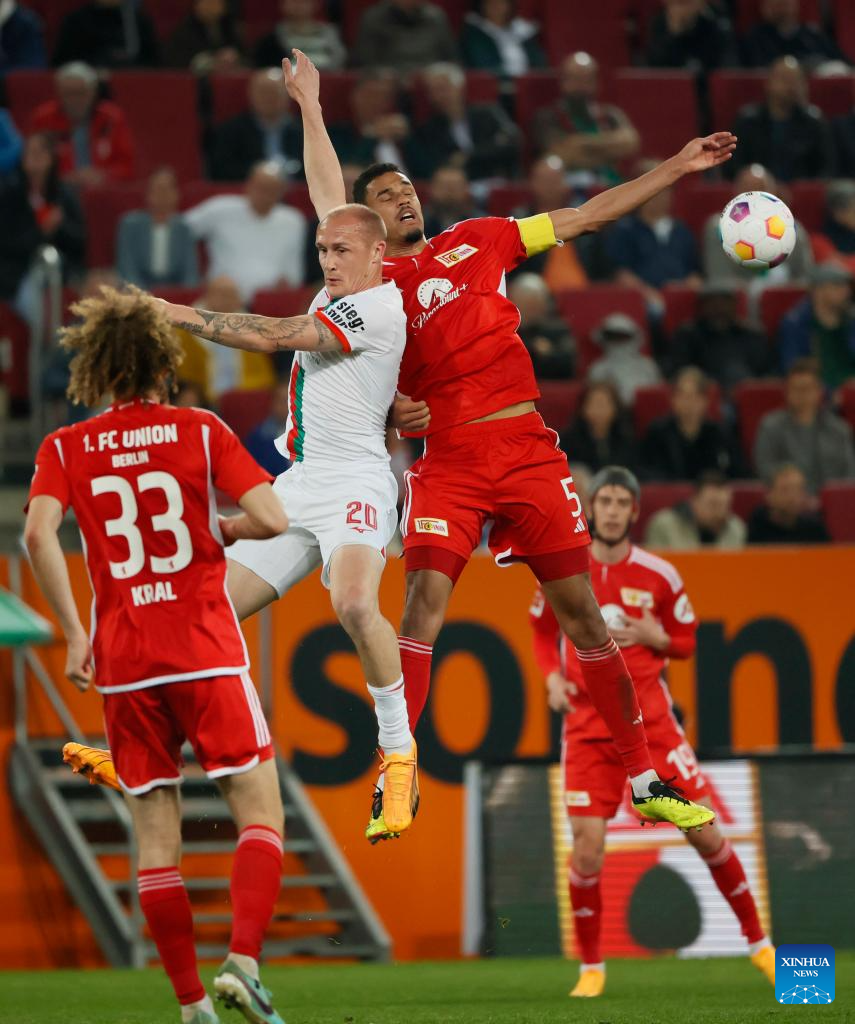 Andras Schaefer (top) of Union Berlin vies for a header during the German first division Bundesliga football match between FC Augsburg and Union Berlin in Augsburg, Germany, April 12, 2024. (Photo by Philippe Ruiz/Xinhua)