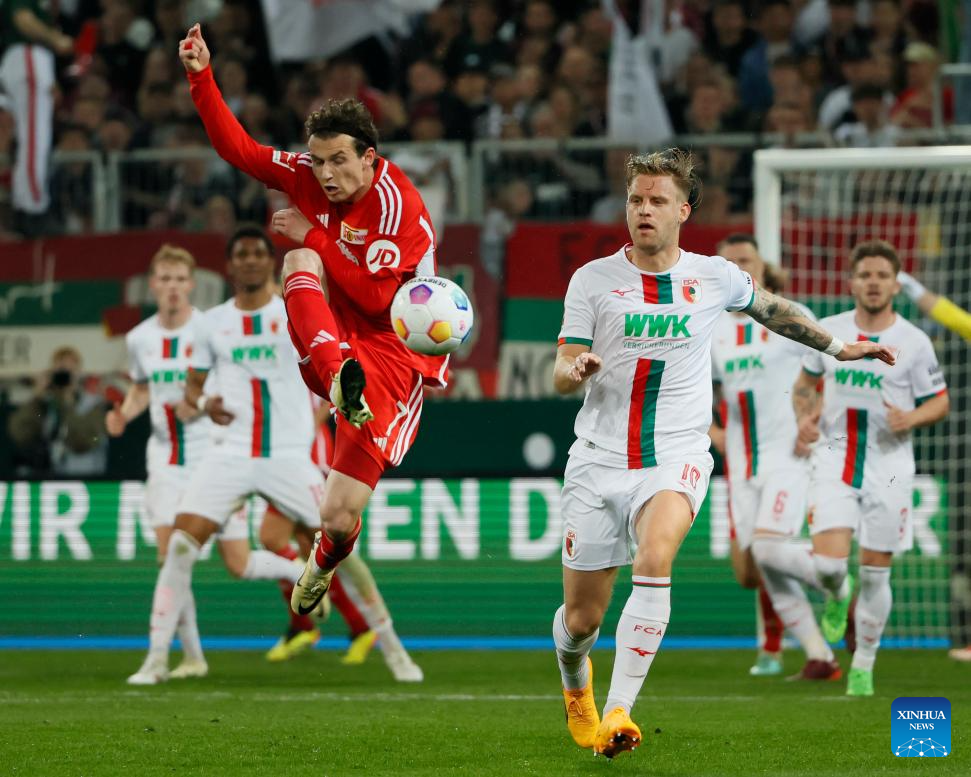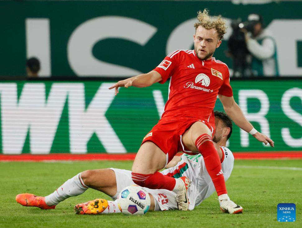 Benedict Hollerbach (front) of Union Berlin vies with Maximilian Bauer of Augsburg during the German first division Bundesliga football match between FC Augsburg and Union Berlin in Augsburg, Germany, April 12, 2024. (Photo by Philippe Ruiz/Xinhua)