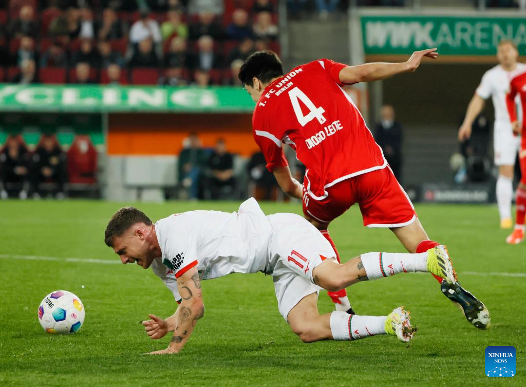 Diogo Leite (R) of Union Berlin vies with Pep Biel Mas Jaume of Augsburg during the German first division Bundesliga football match between FC Augsburg and Union Berlin in Augsburg, Germany, April 12, 2024. (Photo by Philippe Ruiz/Xinhua)