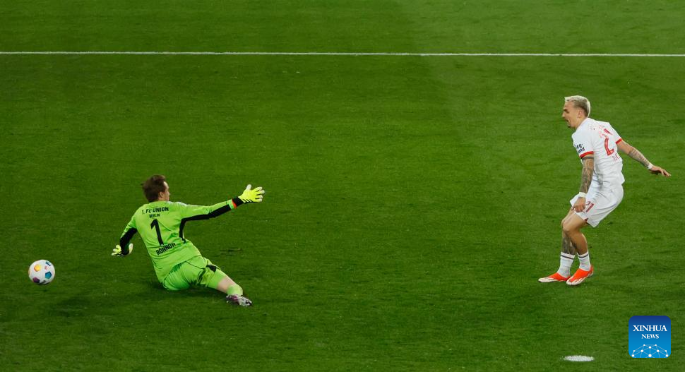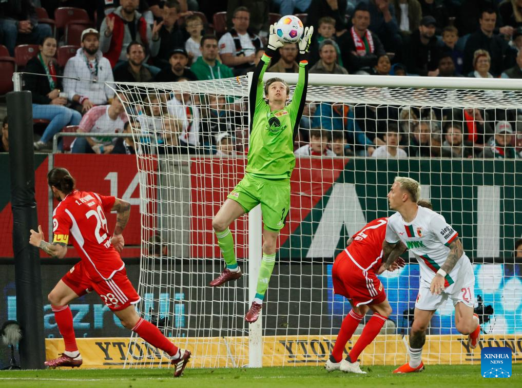 Frederik Ronnow (2nd L), goalkeeper of Union Berlin, makes a save during the German first division Bundesliga football match between FC Augsburg and Union Berlin in Augsburg, Germany, April 12, 2024. (Photo by Philippe Ruiz/Xinhua)