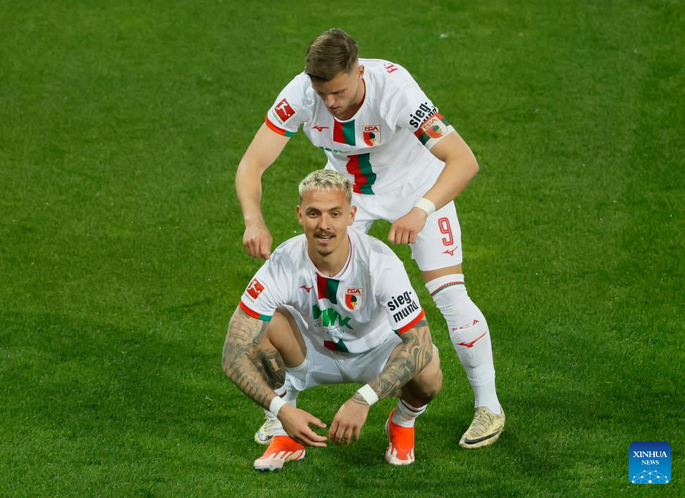 Phillip Tietz (front) of Augsburg celebrates scoring with his teammate Ermedin Demirovic during the German first division Bundesliga football match between FC Augsburg and Union Berlin in Augsburg, Germany, April 12, 2024. (Photo by Philippe Ruiz/Xinhua)