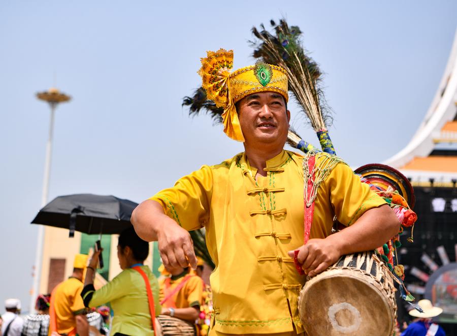 MANGSHI, April 13 (Xinhua) -- The water-splashing festival is regarded as one of the most important festivals observed by the Dai and the De'ang people in Dehong Dai and Jingpo Autonomous Prefecture. People splash water on one another during the festival, wishing happiness and good fortune. This year's festival kicked off here on Friday and will last till April 13.