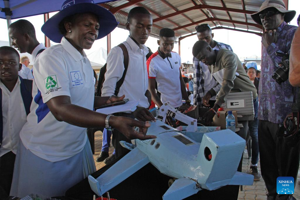 Students display products made from recycled materials during an inauguration ceremony of a waste buyback center in Windhoek, Namibia, on April 12, 2024. Namibia on Friday inaugurated its first waste buyback center (WBBC) which will see residents earn income by collecting and selling recyclable materials at an event held in the informal settlement of Katutura in Windhoek. (Photo by Musa C Kaseke/Xinhua)