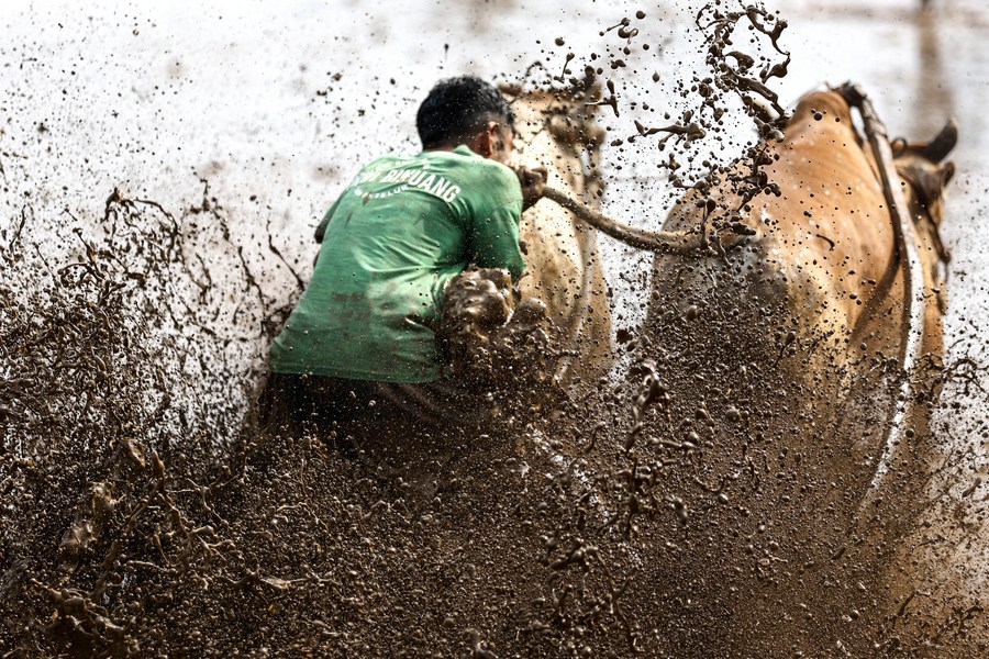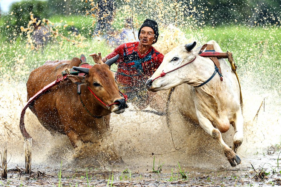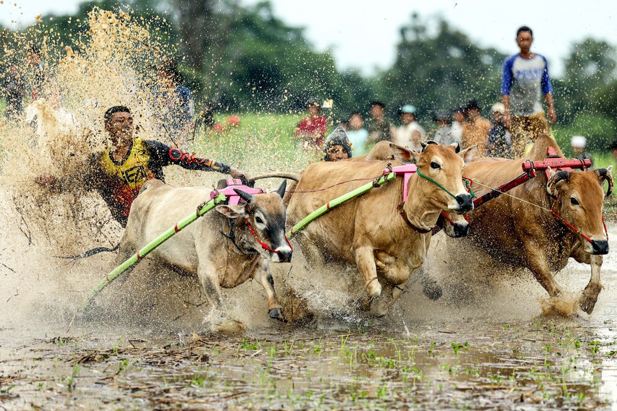 WEST SUMATRA, Indonesia, April 14 (Xinhua) -- The speed and passion of bulls occurred in a traditional Pacu Jawi bull race in West Sumatra, Indonesia, fully showcasing the beauty of strength.