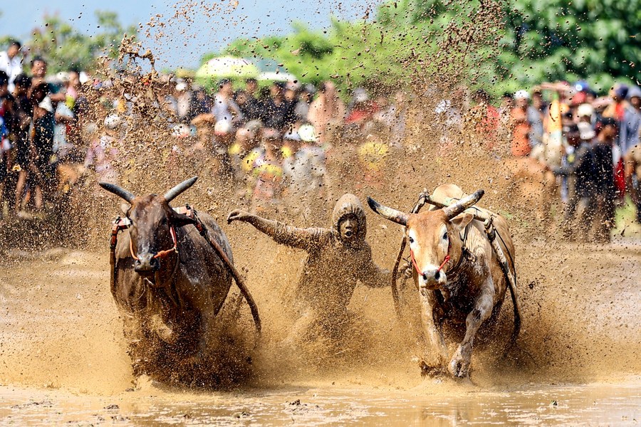 The race is held annually in muddy rice fields to celebrate the end of the harvest season, with hundreds of practiced farmers dual-wielding their bulls, attracting numerous locals and tourists.