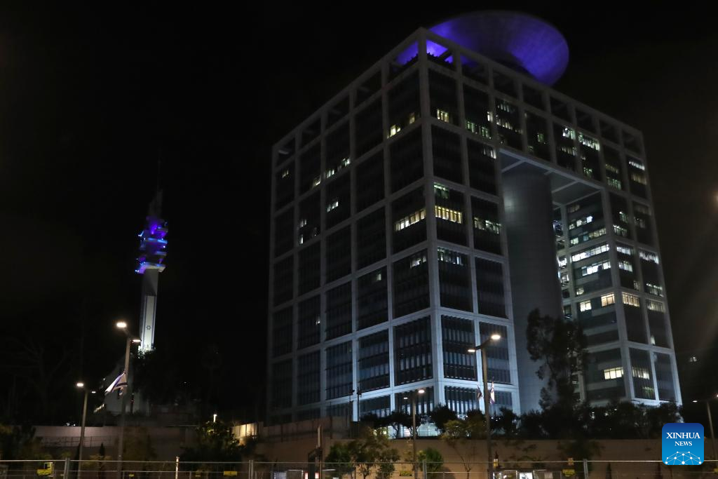 This photo taken on April 13, 2024 shows a building of Israeli Defense Ministry in Tel Aviv, Israel. A combined attack of dozens of ballistic missiles and hundreds of drones from Iran triggered air raid alerts across Israel early on Sunday, the Israeli army said, as residents reported multiple bombings were heard.