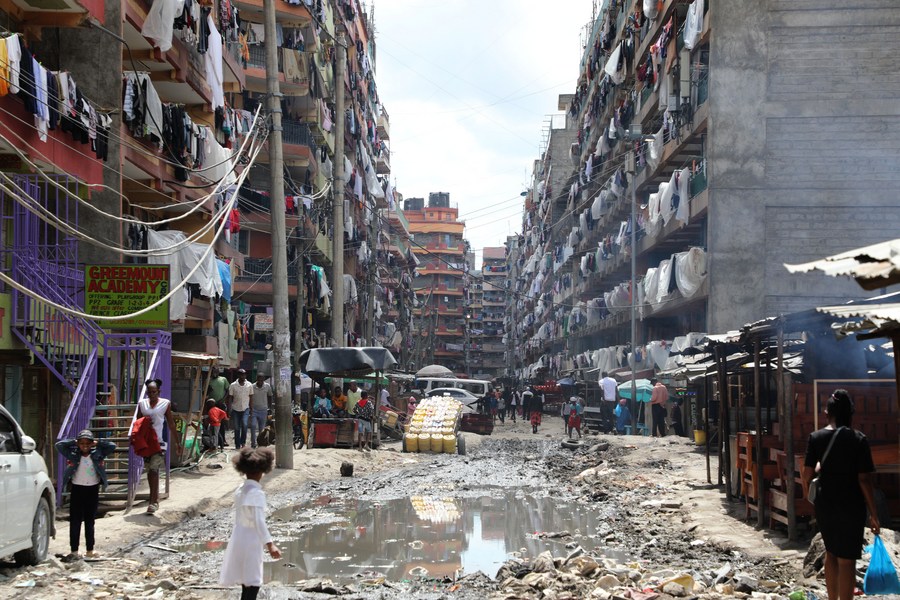 Locals go about their businesses in a polluted street of Pipeline estate in Nairobi, the capital of Kenya, on May 4, 2023. (Photo by John Okoyo/Xinhua)