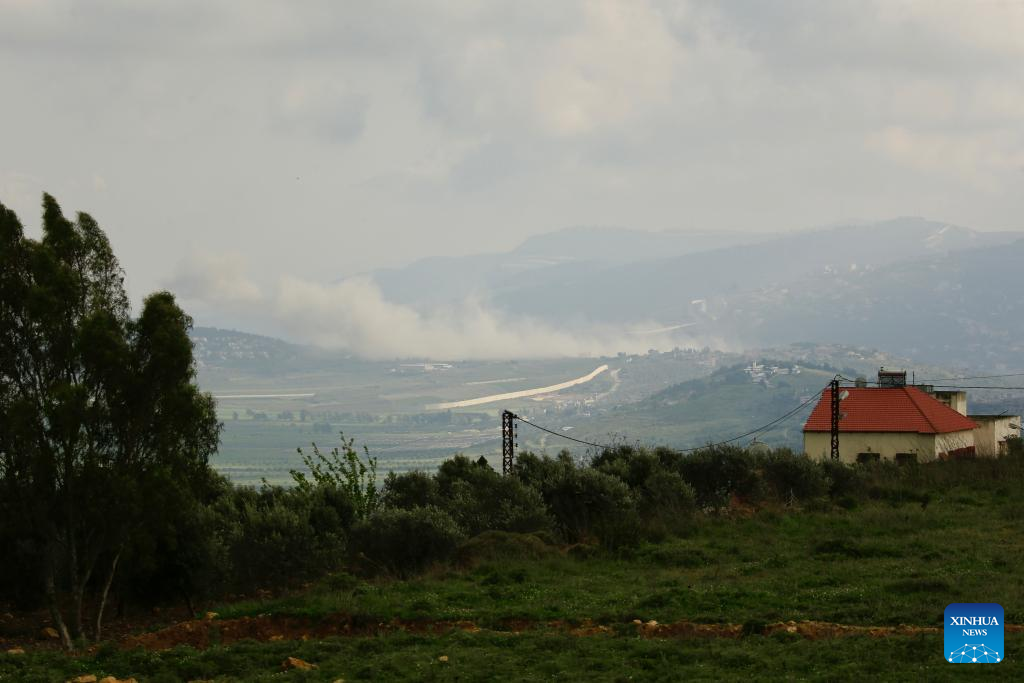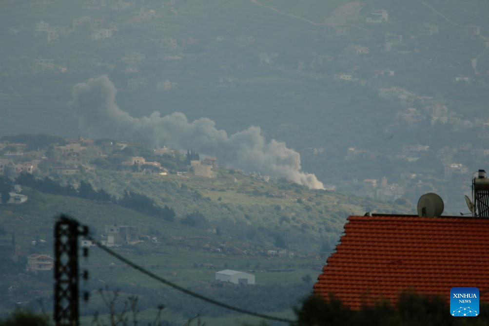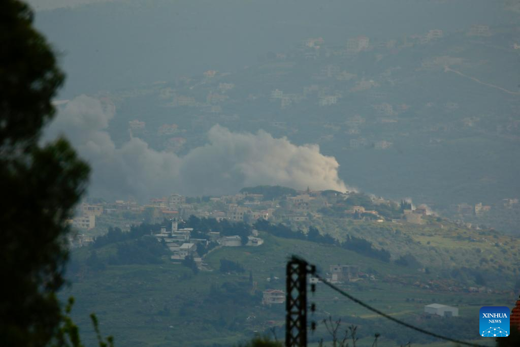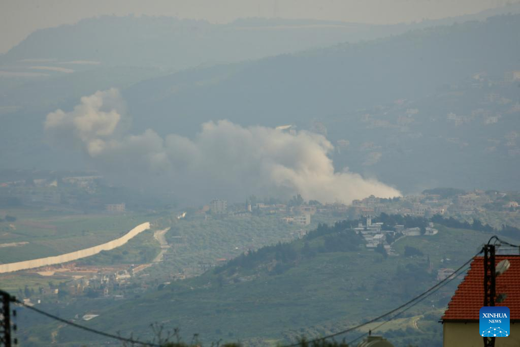 The smoke caused by an Israeli strike can be seen in Marjeyoun, Lebanon, on April 14, 2024. A Lebanese civilian was killed, and five others injured early Sunday morning in Israeli air strikes on a village in southern Lebanon, according to Lebanese military sources. (Photo by Ali Hashisho/Xinhua)