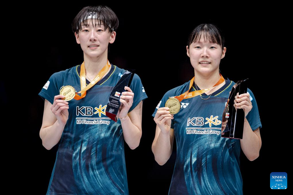 Baek Ha Na (R)/Lee So Hee of South Korea pose during the awarding ceremony after winning the women's doubles final against Zhang Shuxian/Zheng Yu of China at Asia Championships 2024 badminton tournament in Ningbo, east China's Zhejiang Province, April 14, 2024. (Xinhua/Jiang Han)