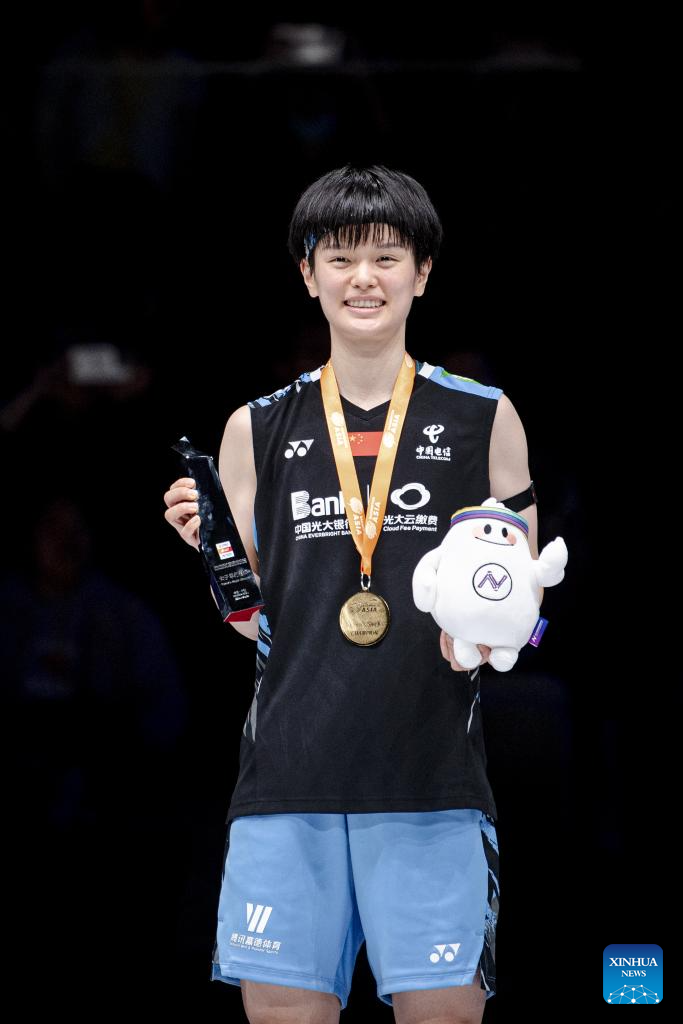 Wang Zhiyi of China poses during the awarding ceremony after winning the women's singles final against her compatriot Chen Yufei at Asia Championships 2024 badminton tournament in Ningbo, east China's Zhejiang Province, April 14, 2024. (Xinhua/Jiang Han)