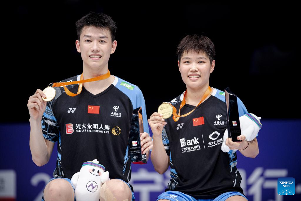 Feng Yanzhe (L)/Huang Dongping of China pose during the awarding ceremony after winning the mixed doubles final against Seo Seung Jae/Chae Yu Jung of South Korea at Asia Championships 2024 badminton tournament in Ningbo, east China's Zhejiang Province, April 14, 2024. (Xinhua/Jiang Han)
