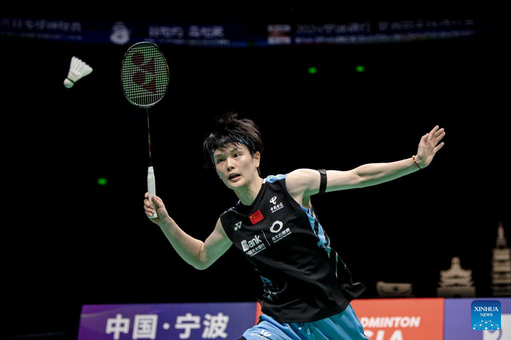 Wang Zhiyi of China hits a return during the women's singles final against her compatriot Chen Yufei at Asia Championships 2024 badminton tournament in Ningbo, east China's Zhejiang Province, April 14, 2024. (Xinhua/Jiang Han)