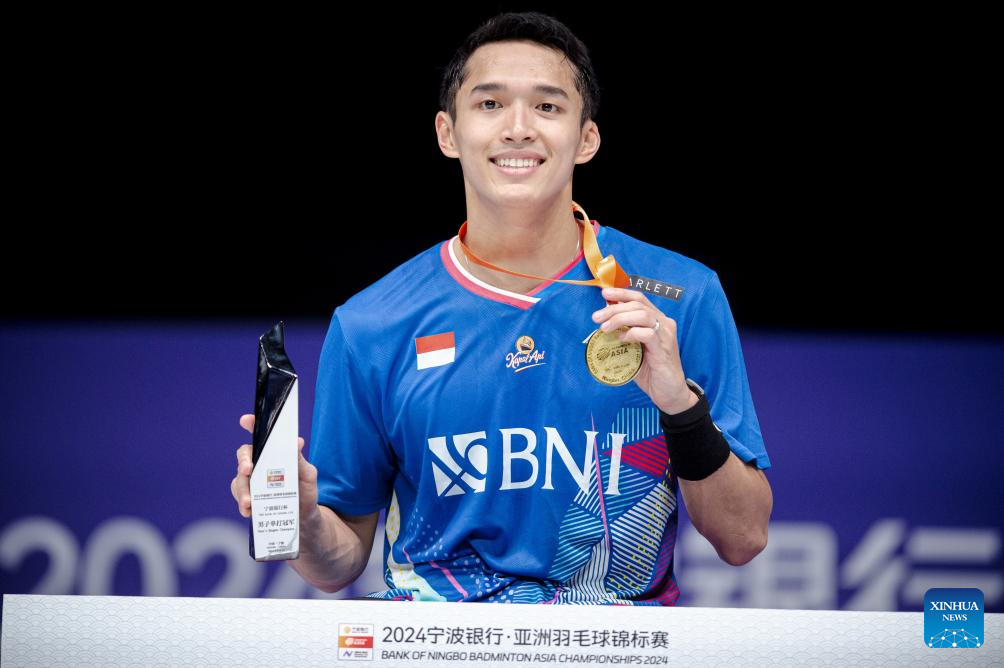 Jonatan Christie of Indonesia celebrates during the awarding ceremony after winning the men's singles final against Li Shifeng of China at Asia Championships 2024 badminton tournament in Ningbo, east China's Zhejiang Province, April 14, 2024. (Xinhua/Jiang Han)