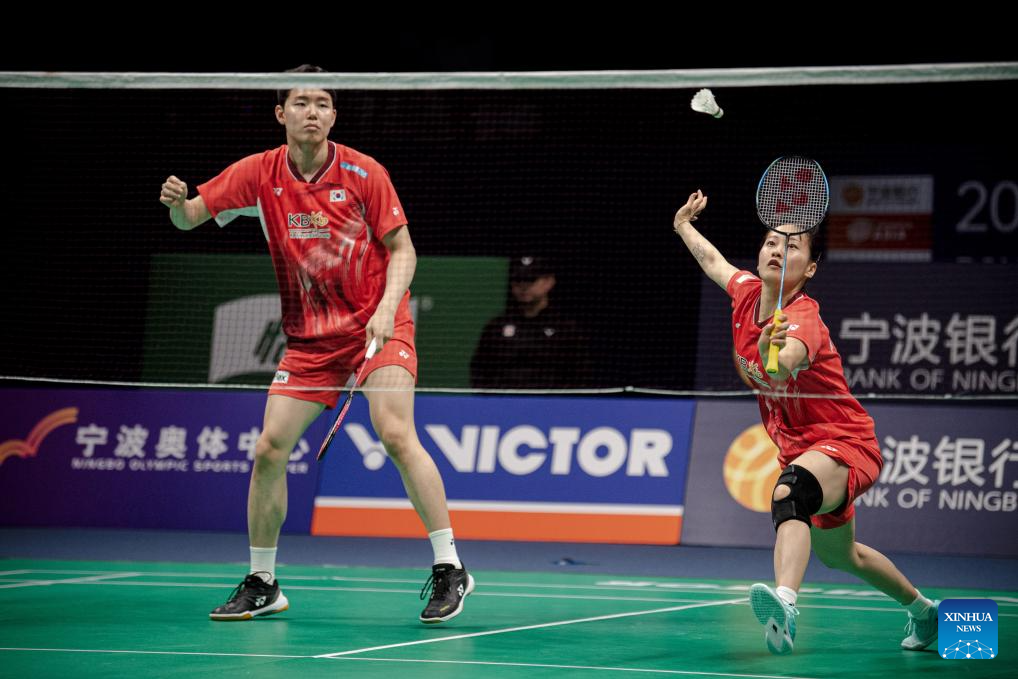 Seo Seung Jae (L)/Chae Yu Jung of South Korea compete during the mixed doubles final against Feng Yanzhe/Huang Dongping of China at Asia Championships 2024 badminton tournament in Ningbo, east China's Zhejiang Province, April 14, 2024. (Xinhua/Jiang Han)