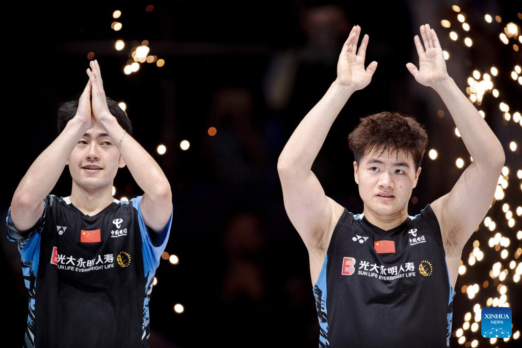 Liang Weikeng (R) /Wang Chang of China celebrate during the awarding ceremony after winning the men's doubles final against Goh Sze Fei/Nur Izzuddin of Malaysia at Asia Championships 2024 badminton tournament in Ningbo, east China's Zhejiang Province, April 14, 2024. (Xinhua/Jiang Han)