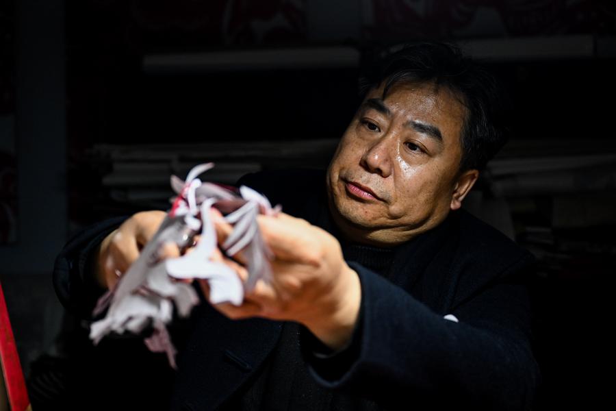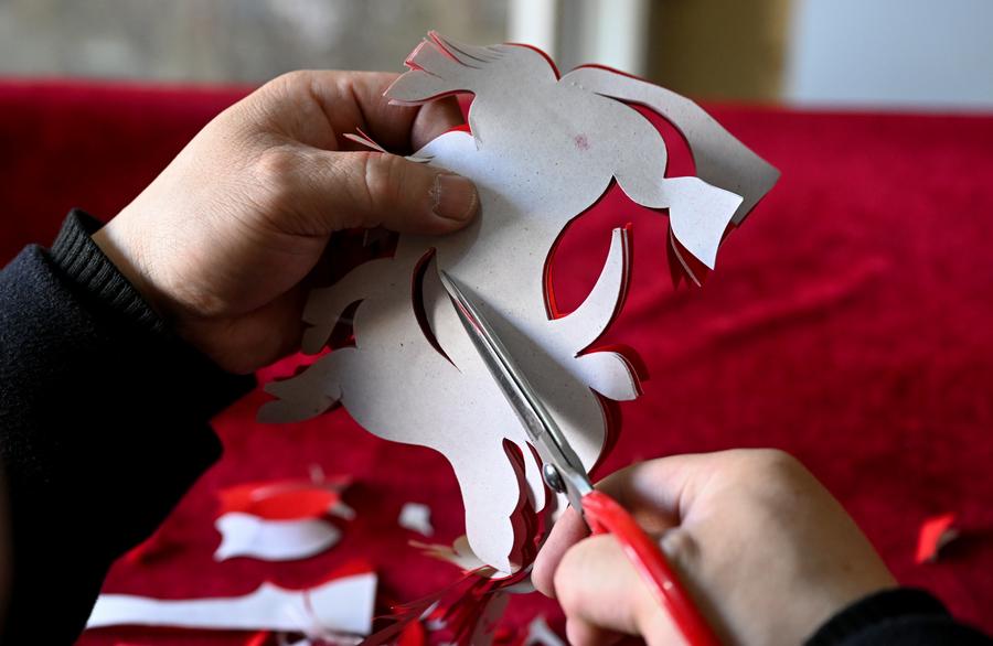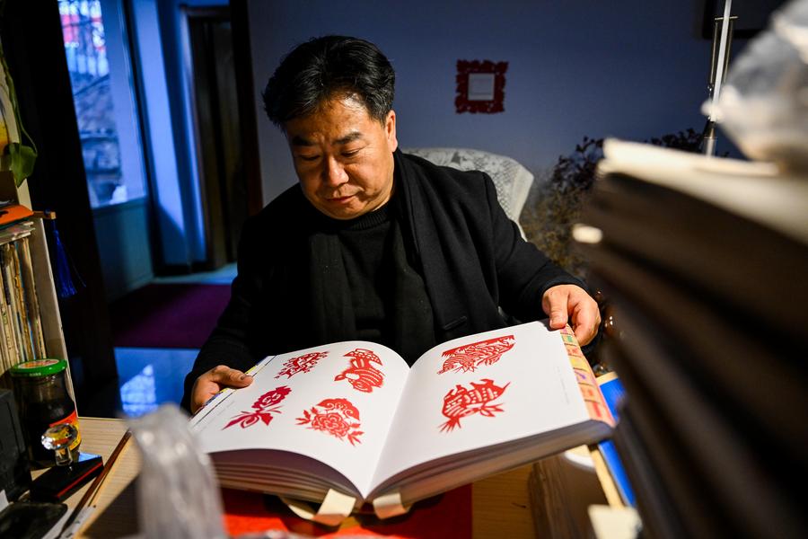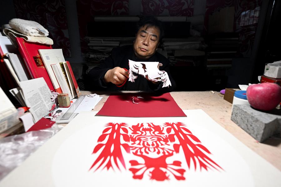 Duan Jianjun makes paper-cutting works at home in Horinger County, north China's Inner Mongolia Autonomous Region, March 14, 2024. (Xinhua/Li Zhipeng)Duan Jianjun makes paper-cutting works at home in Horinger County, north China's Inner Mongolia Autonomous Region, March 14, 2024. (Xinhua/Bei He)