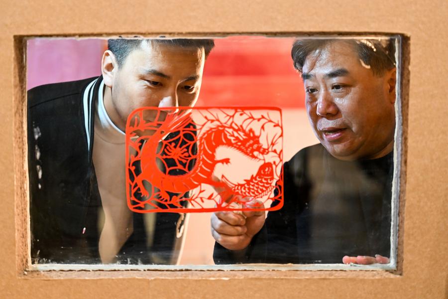 Duan Jianjun checks an ancient window sash component at his institute in Horinger County, north China's Inner Mongolia Autonomous Region, March 14, 2024. (Xinhua/Bei He)Duan Jianjun makes paper-cutting works at his institute in Horinger County, north China's Inner Mongolia Autonomous Region, March 14, 2024. (Xinhua/Bei He)Duan Jianjun reads a book about paper-cutting at home in Horinger County, north China's Inner Mongolia Autonomous Region, March 14, 2024. (Xinhua/Li Zhipeng)Duan Jianjun stands outside an old residence in Horinger County, north China's Inner Mongolia Autonomous Region, March 15, 2024. (Xinhua/Bei He)Duan Jianjun (R) and his apprentice Bao Zhiming view a paper-cutting work at an exhibition hall in Horinger County, north China's Inner Mongolia Autonomous Region, March 14, 2024. (Xinhua/Li Zhipeng)