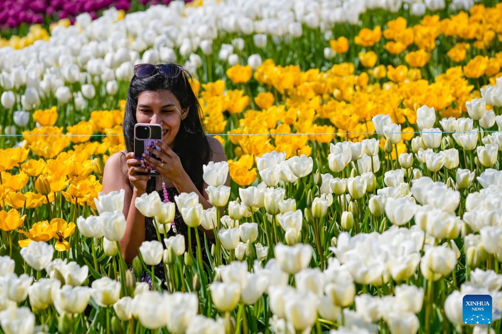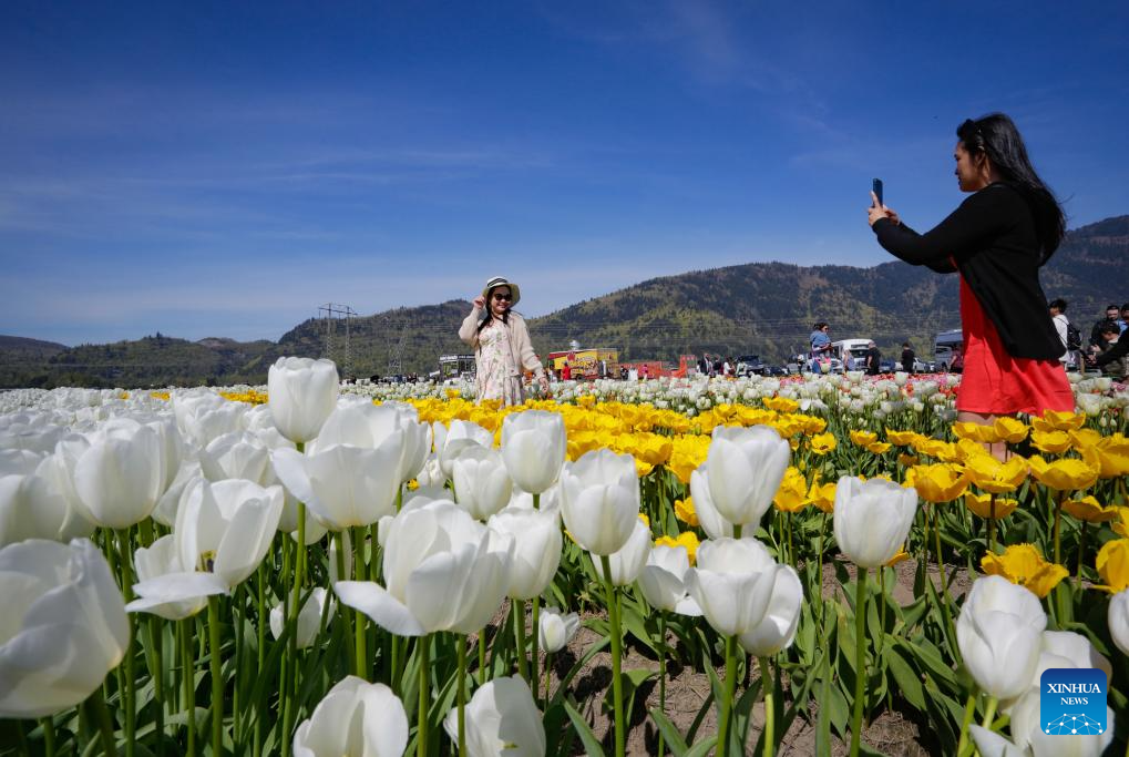 People take photos between rows of tulips at the Abbotsford Tulip Festival in Abbotsford, British Columbia, Canada, on April 14, 2024. (Photo by Liang Sen/Xinhua)